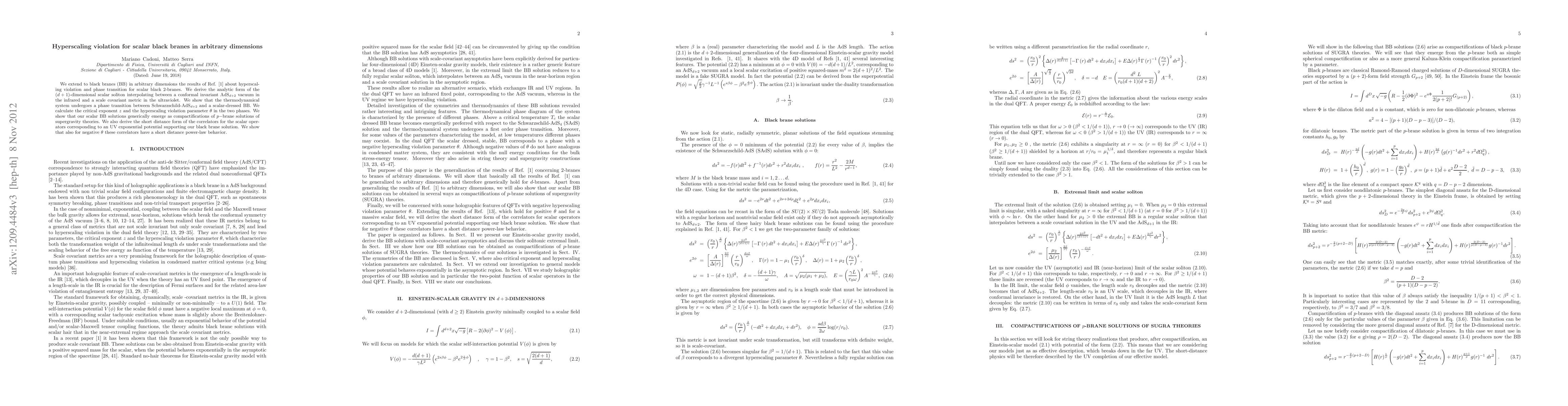 We extend to black branes (BB) in arbitrary dimensions the results of Ref. [1] about hyperscaling violation and phase transition for scalar black 2-branes. We derive the analytic form of the (d+1)-dimensional scalar soliton interpolating between a conformal invariant AdS vacuum in the infrared and a scale covariant metric in the ultraviolet. We show that the thermodynamical system undergoes a phase transition between Schwarzschild-AdS and a scalar-dressed BB. We calculate the critical exponent and the hyperscaling violation parameter in the two phases. We show that our scalar BB solutions generically emerge as compactifications of p-brane solutions of supergravity theories. We also derive the short distance form of the correlators for the scalar operators corresponding to an UV exponential potential supporting our black brane solution. We show that also for negative values of the hyperscaling violation parameter these correlators have a short distance power-law behavior.