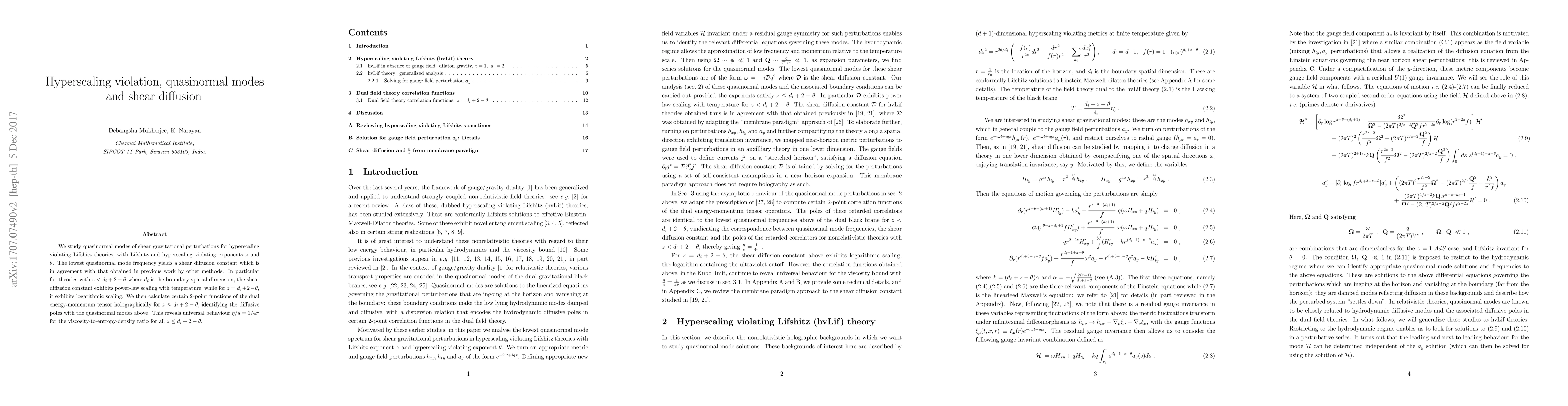 This paper explores quasinormal modes of shear gravitational perturbations in hyperscaling violating Lifshitz theories, finding that the lowest frequency corresponds to a shear diffusion constant. It reveals power-law or logarithmic scaling of the shear diffusion constant with temperature depending on the Lifshitz exponent, and identifies universal viscosity-to-entropy ratio $\eta/s=1/4\pi$ for certain theories.