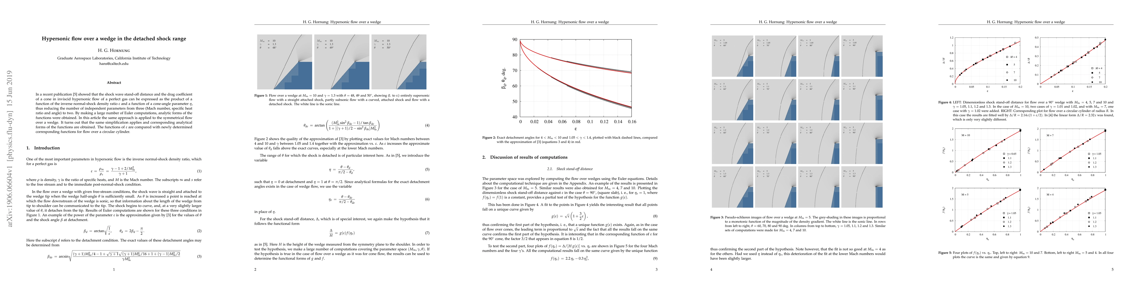 This paper extends Hornung's (2019) simplification of hypersonic flow parameters for a cone to a wedge, deriving analytical functions for shock stand-off distance and drag coefficient in terms of two parameters. Comparisons are made with functions derived for flow over a circular cylinder.