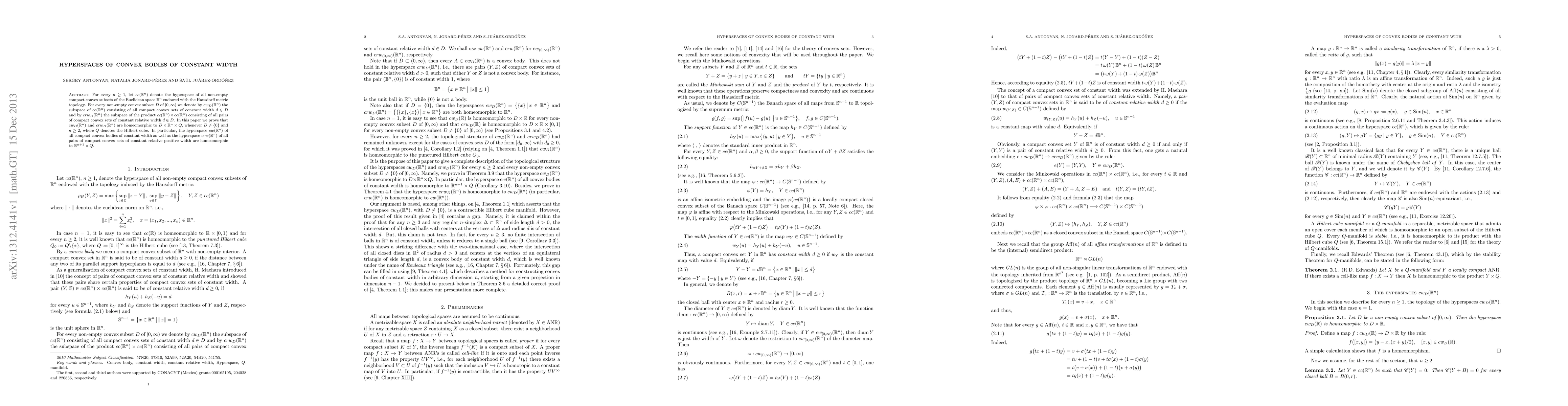 The work extends previous findings by proving homeomorphisms for hyperspaces of pairs of compact convex sets of constant relative width and proving that cw(R^n) and crw(R^n) are homeomorphic to R^(n+1) x Q.