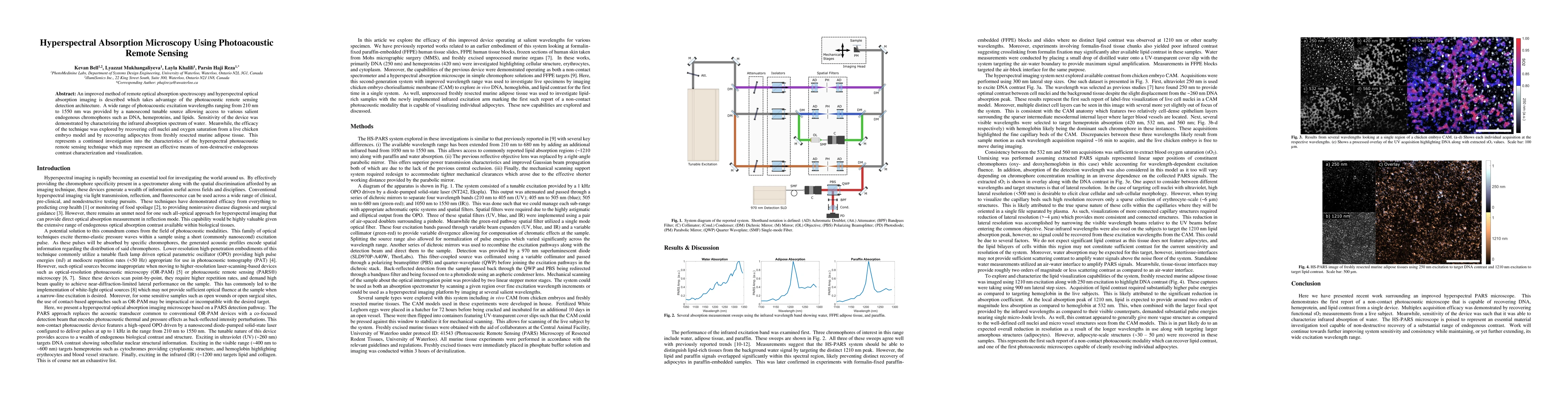 An improved method of remote optical absorption spectroscopy and hyperspectral optical absorption imaging is described which takes advantage of the photoacoustic remote sensing detection architecture. A wide range of photoacoustic excitation wavelengths ranging from 210 nm to 1550 nm was provided by a nanosecond tunable source allowing access to various salient endogenous chromophores such as DNA, hemeproteins, and lipids. Sensitivity of the device was demonstrated by characterizing the infrared absorption spectrum of water. Meanwhile, the efficacy of the technique was explored by recovering cell nuclei and oxygen saturation from a live chicken embryo model and by recovering adipocytes from freshly resected murine adipose tissue. This represents a continued investigation into the characteristics of the hyperspectral photoacoustic remote sensing technique which may represent an effective means of non-destructive endogenous contrast characterization and visualization.