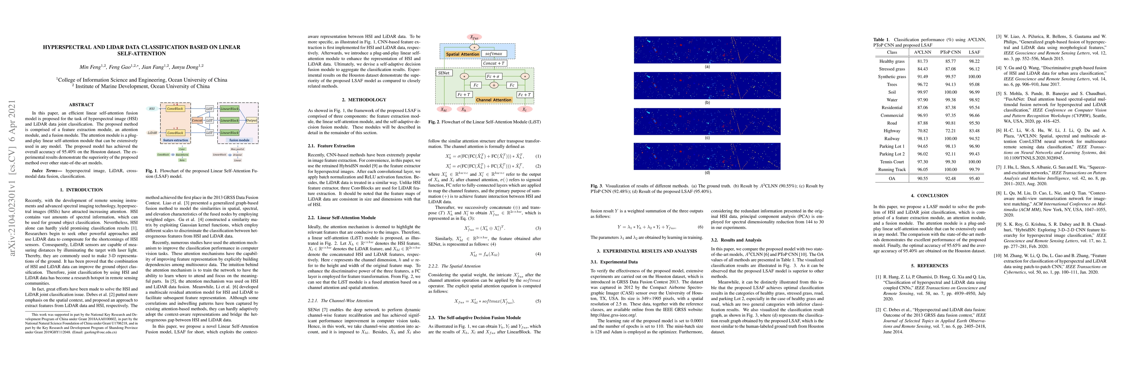 This paper proposes a linear self-attention fusion model for classifying hyperspectral image (HSI) and LiDAR data, achieving 95.40% accuracy on the Houston dataset. The model includes a feature extraction, an attention, and a fusion module, showcasing superior performance compared to other state-of-the-art methods.