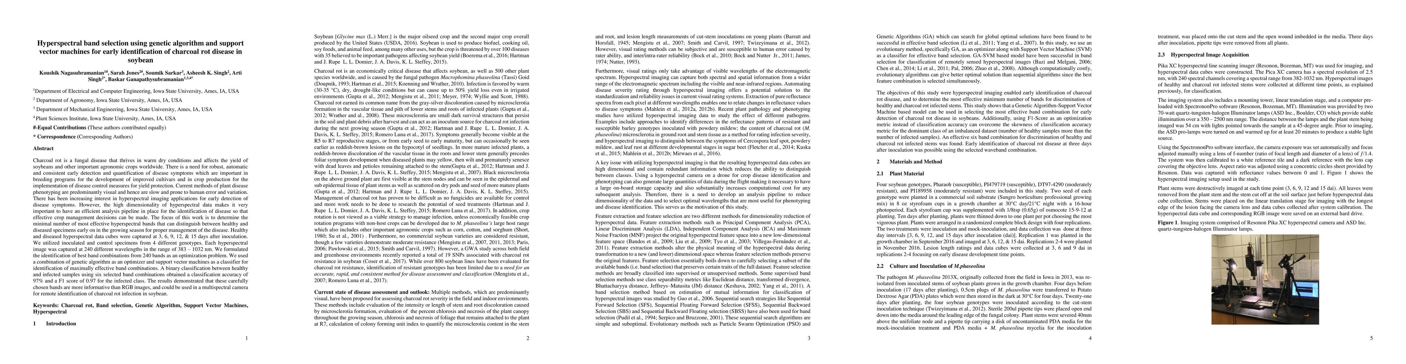 This research uses a genetic algorithm and support vector machines to select the most effective hyperspectral bands for early detection of charcoal rot disease in soybean. The method achieved 97% classification accuracy, demonstrating the potential of hyperspectral imaging for remote identification of the disease, surpassing traditional RGB imaging.