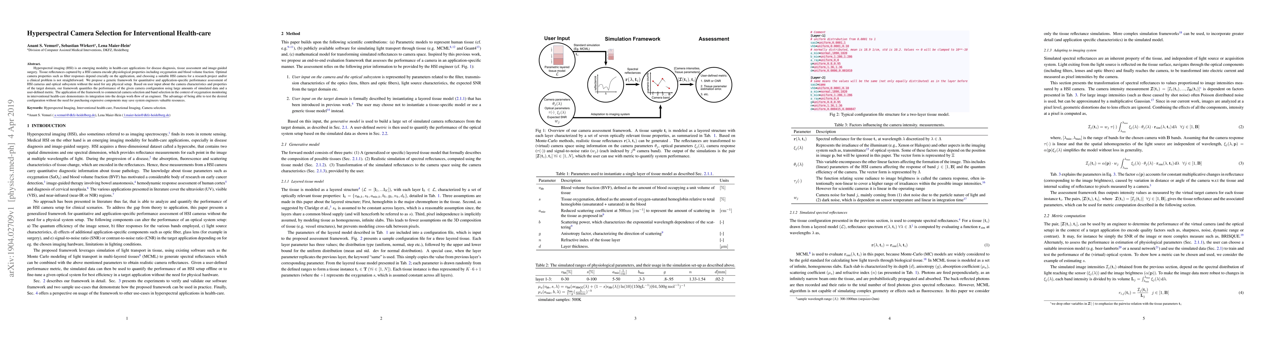 Hyperspectral imaging (HSI) is an emerging modality in health-care applications for disease diagnosis, tissue assessment and image-guided surgery. Tissue reflectances captured by a HSI camera encode physiological properties including oxygenation and blood volume fraction. Optimal camera properties such as filter responses depend crucially on the application, and choosing a suitable HSI camera for a research project and/or a clinical problem is not straightforward. We propose a generic framework for quantitative and application-specific performance assessment of HSI cameras and optical subsystem without the need for any physical setup. Based on user input about the camera characteristics and properties of the target domain, our framework quantifies the performance of the given camera configuration using large amounts of simulated data and a user-defined metric. The application of the framework to commercial camera selection and band selection in the context of oxygenation monitoring in interventional health-care demonstrates its integration into the design work-flow of an engineer. The advantage of being able to test the desired configuration without the need for purchasing expensive components may save system engineers valuable resources.