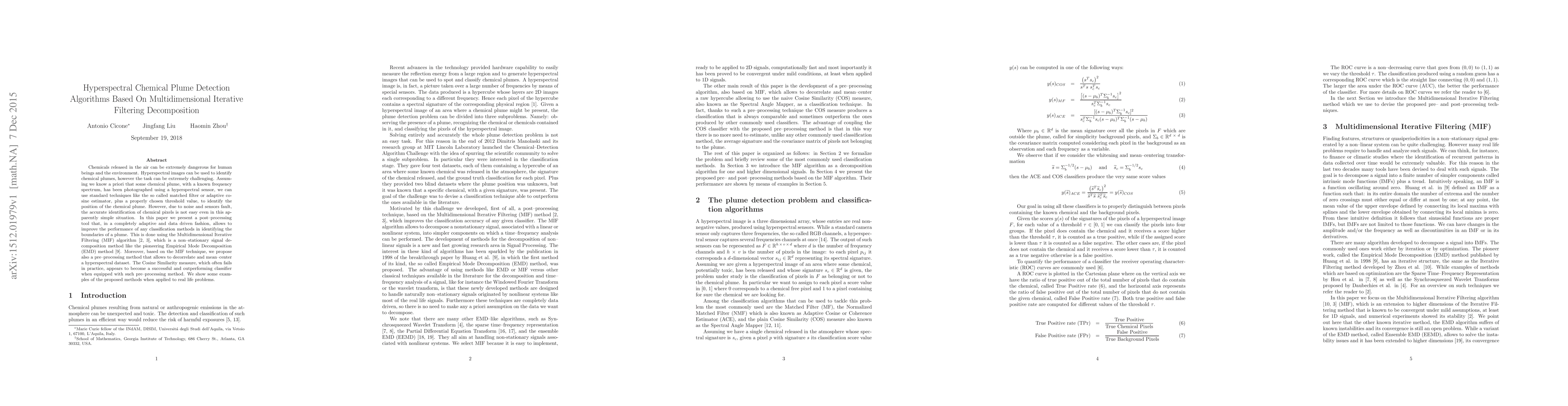 This paper introduces a Multidimensional Iterative Filtering (MIF) decomposition algorithm to enhance hyperspectral chemical plume detection. The MIF technique improves classification methods by adaptively identifying plume boundaries, overcoming noise and sensor faults, and is shown to outperform traditional cosine similarity measures when used with a proposed pre-processing method.