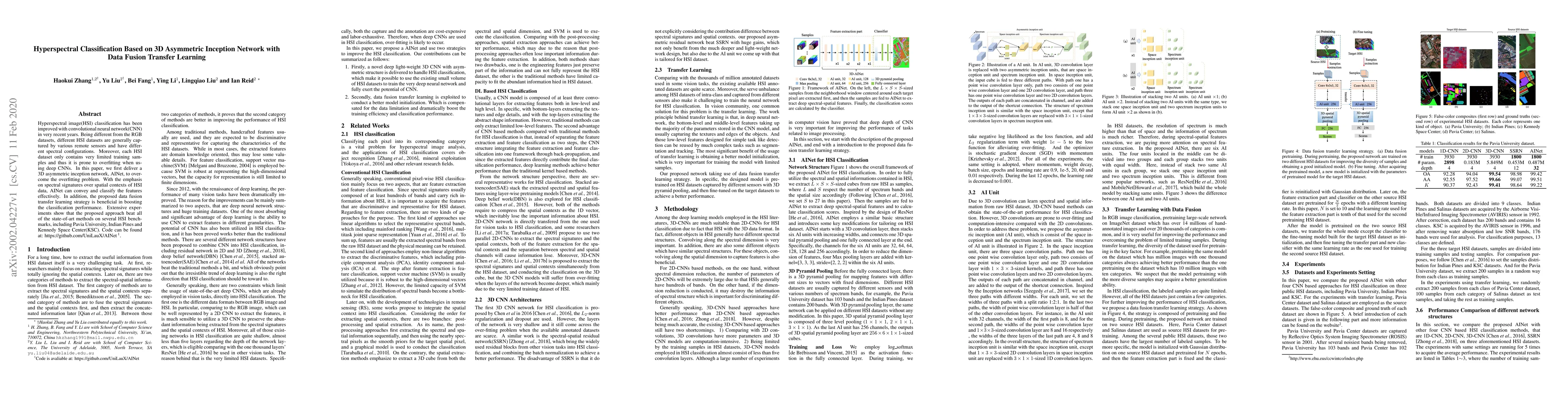 Hyperspectral image(HSI) classification has been improved with convolutional neural network(CNN) in very recent years. Being different from the RGB datasets, different HSI datasets are generally captured by various remote sensors and have different spectral configurations. Moreover, each HSI dataset only contains very limited training samples and thus it is prone to overfitting when using deep CNNs. In this paper, we first deliver a 3D asymmetric inception network, AINet, to overcome the overfitting problem. With the emphasis on spectral signatures over spatial contexts of HSI data, AINet can convey and classify the features effectively. In addition, the proposed data fusion transfer learning strategy is beneficial in boosting the classification performance. Extensive experiments show that the proposed approach beat all of the state-of-art methods on several HSI benchmarks, including Pavia University, Indian Pines and Kennedy Space Center(KSC). Code can be found at: https://github.com/UniLauX/AINet.