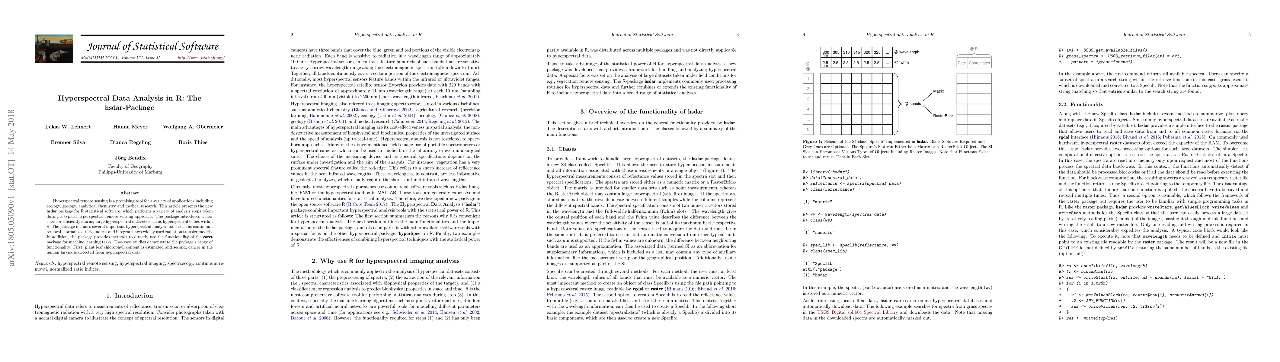 The hsdar package in R facilitates comprehensive hyperspectral data analysis, including continuum removal, normalized ratio indices, and machine learning tasks, with applications demonstrated in estimating plant chlorophyll and detecting laryngeal cancer. It introduces an efficient data class for managing large hyperspectral datasets.