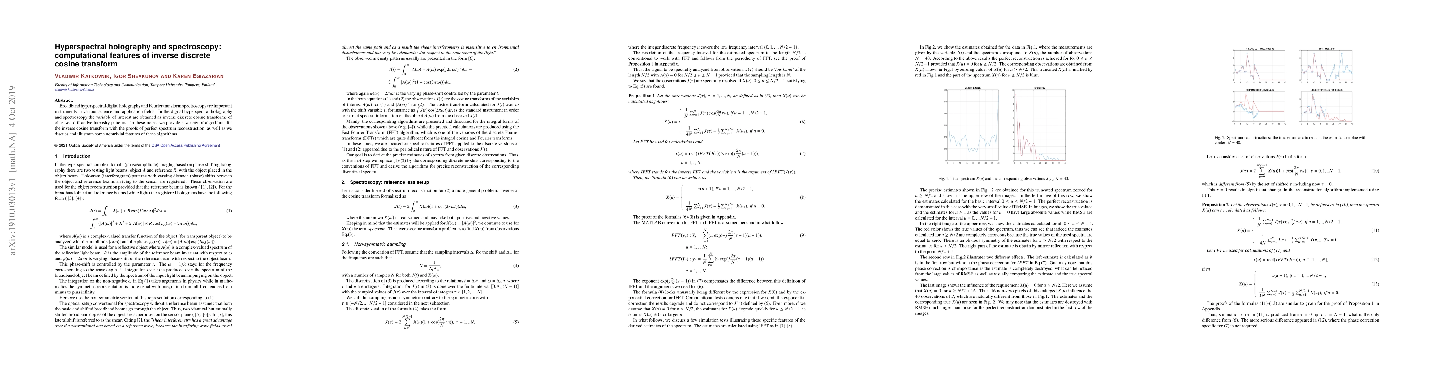 Broadband hyperspectral digital holography and Fourier transform spectroscopy are important instruments in various science and application fields. In the digital hyperspectral holography and spectroscopy the variable of interest are obtained as inverse discrete cosine transforms of observed diffractive intensity patterns. In these notes, we provide a variety of algorithms for the inverse cosine transform with the proofs of perfect spectrum reconstruction, as well as we discuss and illustrate some nontrivial features of these algorithms.