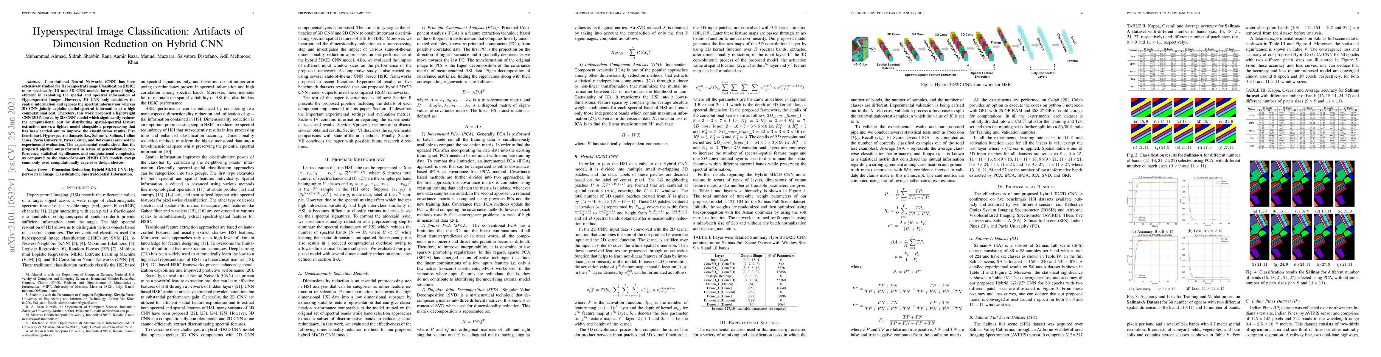 Convolutional Neural Networks (CNN) has been extensively studied for Hyperspectral Image Classification (HSIC) more specifically, 2D and 3D CNN models have proved highly efficient in exploiting the spatial and spectral information of Hyperspectral Images. However, 2D CNN only considers the spatial information and ignores the spectral information whereas 3D CNN jointly exploits spatial-spectral information at a high computational cost. Therefore, this work proposed a lightweight CNN (3D followed by 2D-CNN) model which significantly reduces the computational cost by distributing spatial-spectral feature extraction across a lighter model alongside a preprocessing that has been carried out to improve the classification results. Five benchmark Hyperspectral datasets (i.e., SalinasA, Salinas, Indian Pines, Pavia University, Pavia Center, and Botswana) are used for experimental evaluation. The experimental results show that the proposed pipeline outperformed in terms of generalization performance, statistical significance, and computational complexity, as compared to the state-of-the-art 2D/3D CNN models except commonly used computationally expensive design choices.
