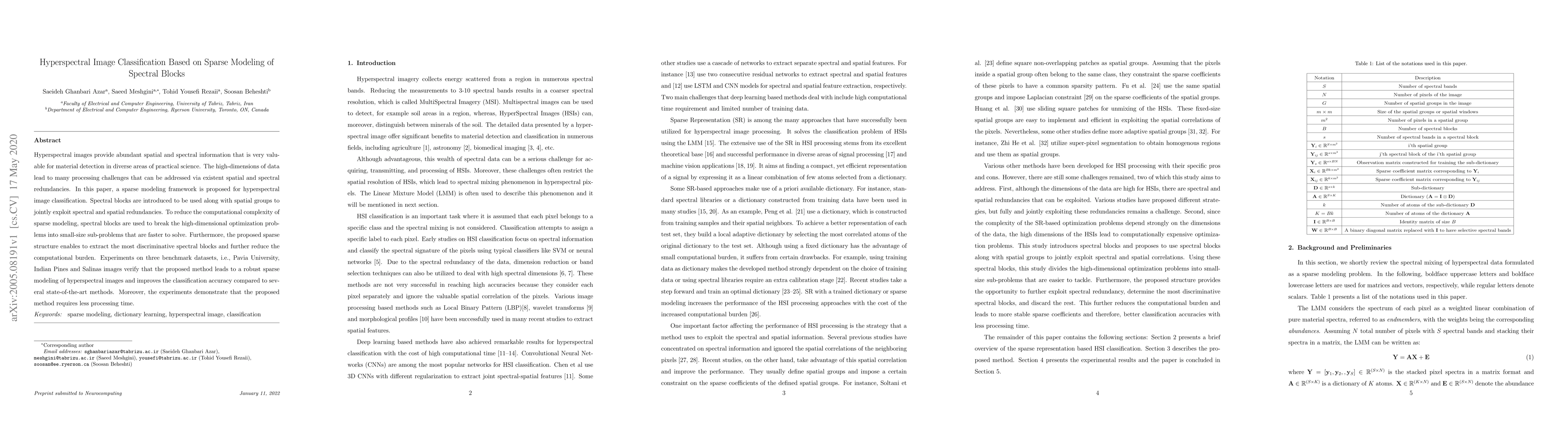 This paper proposes a sparse modeling framework for hyperspectral image classification that utilizes spectral blocks and spatial groups to exploit redundancies, breaking high-dimensional optimization into smaller sub-problems to enhance computational efficiency and classification accuracy. Experiments on benchmark datasets show improved accuracy and reduced processing time compared to state-of-the-art methods.