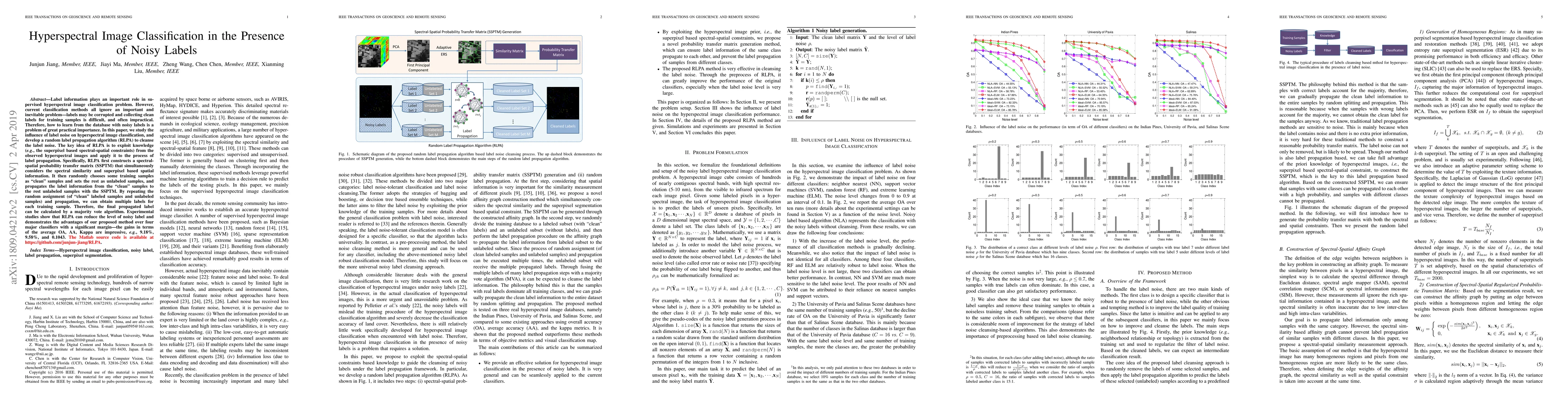 This paper addresses the challenge of noisy labels in supervised hyperspectral image classification by proposing a Random Label Propagation Algorithm (RLPA). RLPA leverages spectral-spatial constraints to cleanse label noise, achieving significant improvements over major classifiers in terms of overall accuracy, average accuracy, and Kappa coefficient.