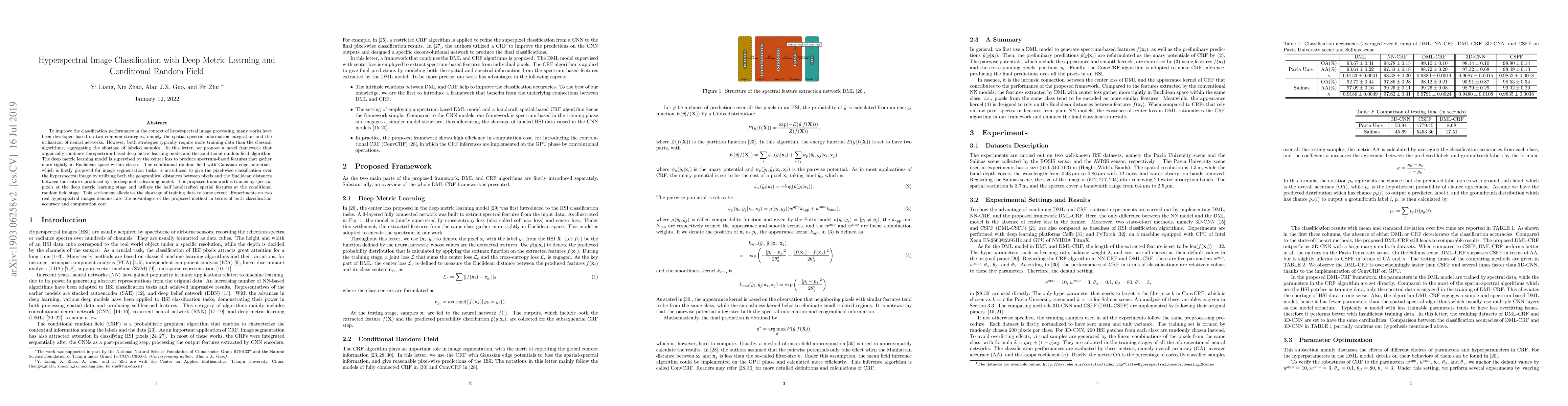 This paper proposes a novel framework combining deep metric learning and conditional random fields to improve hyperspectral image classification, addressing the challenge of limited labeled data. The deep metric learning model, supervised by center loss, generates tightly clustered spectrum-based features, while the conditional random field utilizes both spatial and spectral information for pixel-wise classification, demonstrating improved accuracy and efficiency.
