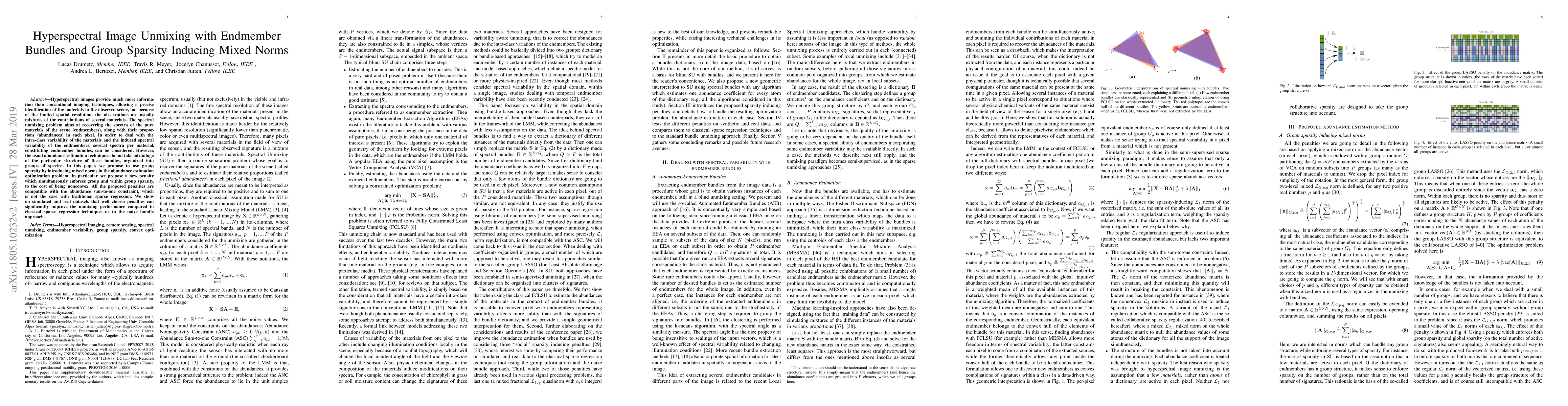 This paper proposes a novel method for hyperspectral image unmixing using endmember bundles and group sparsity induced by mixed norms to improve the estimation of material spectra and their proportions. The new penalties enforce both group and within group sparsity, enhancing unmixing performance over traditional methods, as demonstrated on both simulated and real datasets.