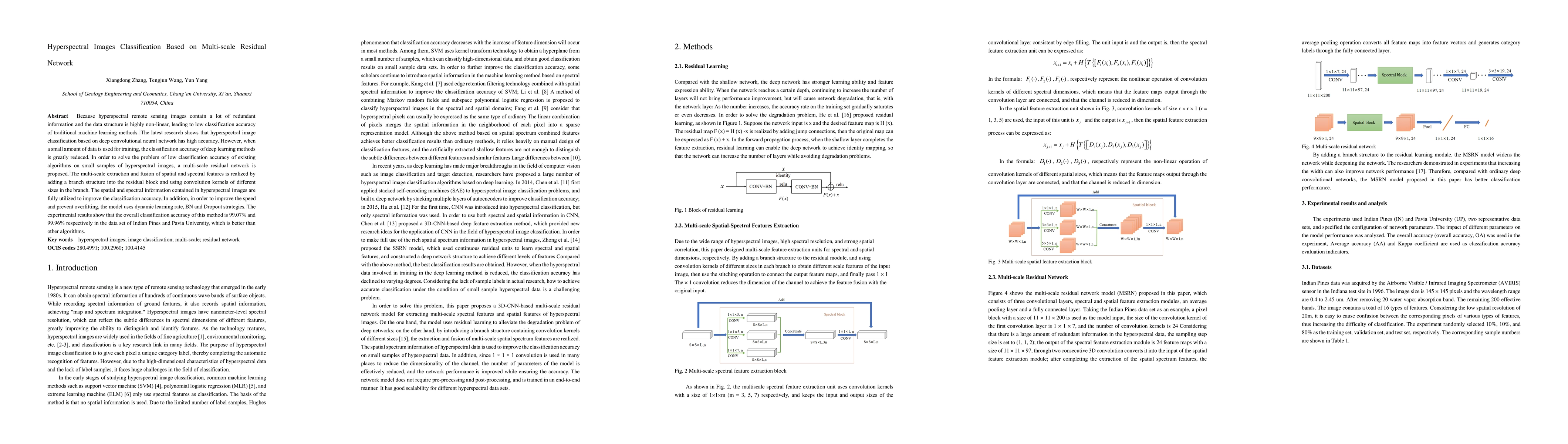 This paper proposes a multi-scale residual network for hyperspectral image classification, addressing low accuracy in small sample scenarios. The method enhances feature extraction and fusion, achieving 99.07% and 99.96% accuracy on Indian Pines and Pavia University datasets, outperforming other algorithms.