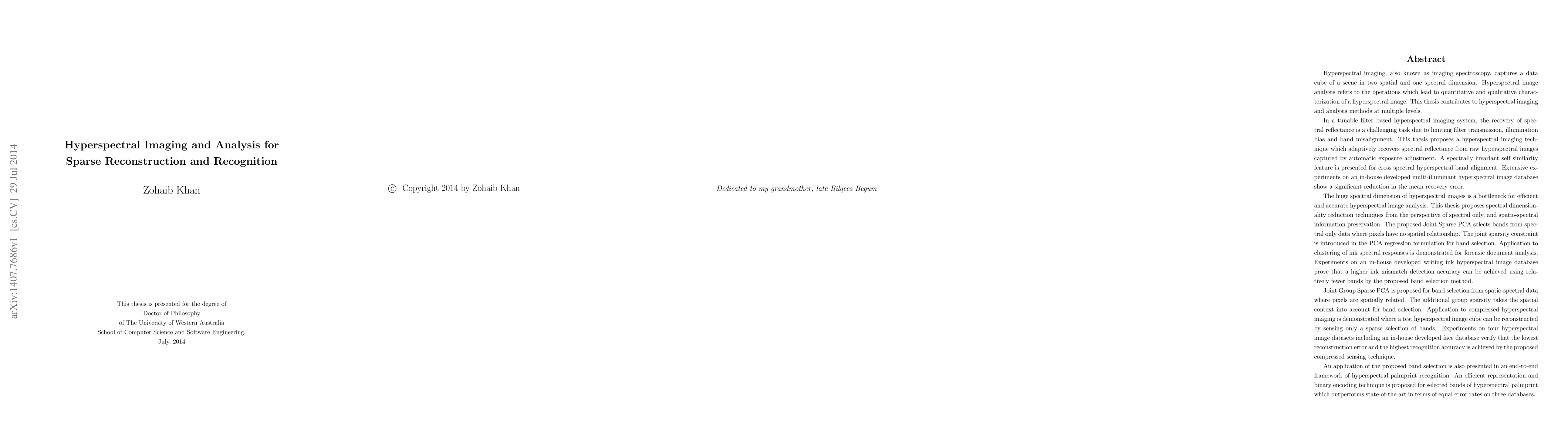 This thesis proposes spatio-spectral techniques for hyperspectral image analysis. Adaptive spatio-spectral support and variable exposure hyperspectral imaging is demonstrated to improve spectral reflectance recovery from hyperspectral images. Novel spectral dimensionality reduction techniques have been proposed from the perspective of spectral only and spatio-spectral information preservation. It was found that the joint sparse and joint group sparse hyperspectral image models achieve lower reconstruction error and higher recognition accuracy using only a small subset of bands. Hyperspectral image databases have been developed and made publicly available for further research in compressed hyperspectral imaging, forensic document analysis and spectral reflectance recovery.