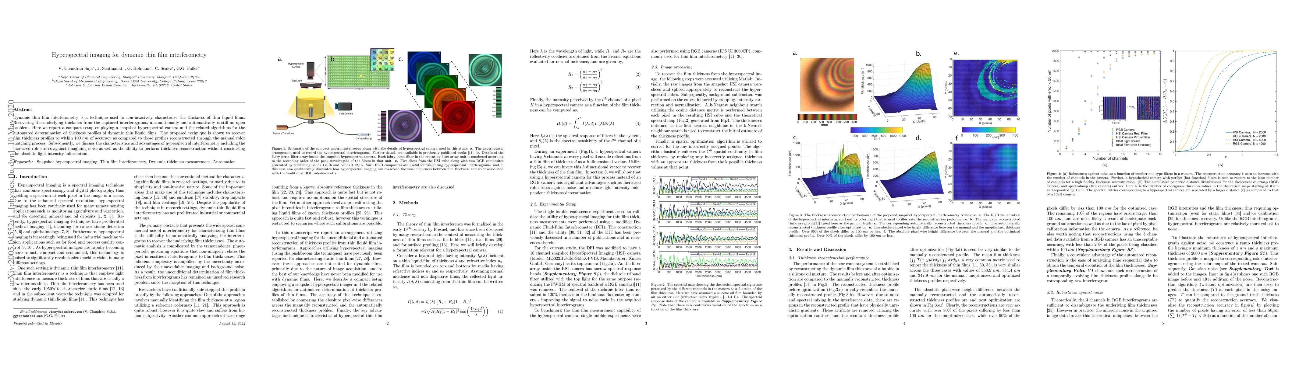 Dynamic thin film interferometry is a technique used to non-invasively characterize the thickness of thin liquid films. Recovering the underlying thickness from the captured interferograms, unconditionally and automatically is still an open problem. Here we report a compact setup employing a snapshot hyperspectral camera and the related algorithms for the automated determination of thickness profiles of dynamic thin liquid films. The proposed technique is shown to recover film thickness profiles to within 100 nm of accuracy as compared to those profiles reconstructed through the manual color matching process. Subsequently, we discuss the characteristics and advantages of hyperspectral interferometry including the increased robustness against imagining noise as well as the ability to perform thickness reconstruction without considering the absolute light intensity information.