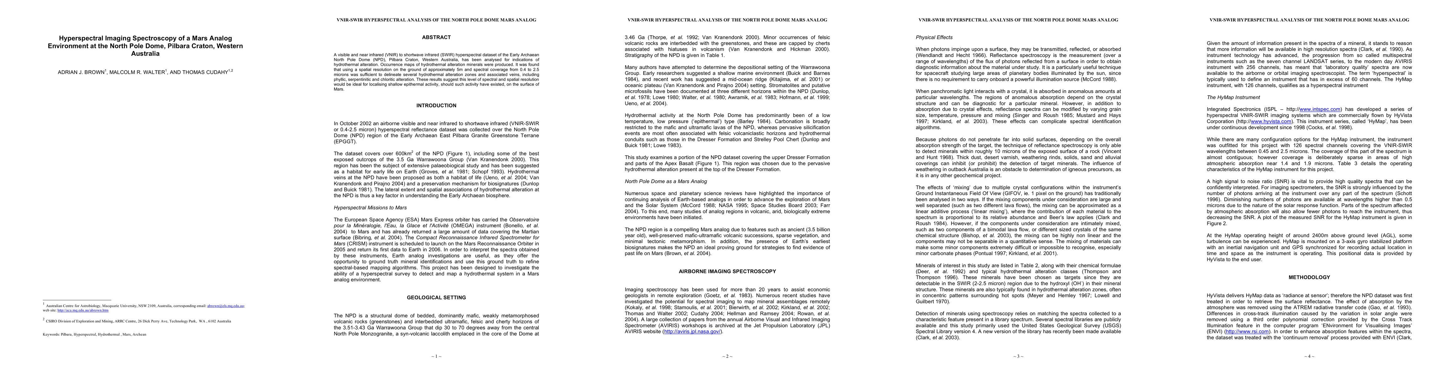 A visible and near infrared (VNIR) to shortwave infrared (SWIR) hyperspectral dataset of the Early Archaean North Pole Dome, Pilbara Craton, Western Australia, has been analysed for indications of hydrothermal alteration. Occurrence maps of hydrothermal alteration minerals were produced. It was found that using a spatial resolution on the ground of approximately 5 m and spectral coverage from 0.4 to 2.5 mm was sufficient to delineate several hydrothermal alteration zones and associated veins, including phyllic, serpentinitic and chloritic alteration. These results suggest this level of spectral and spatial resolution would be ideal for localising shallow epithermal activity, should such activity have existed, on the surface of Mars.