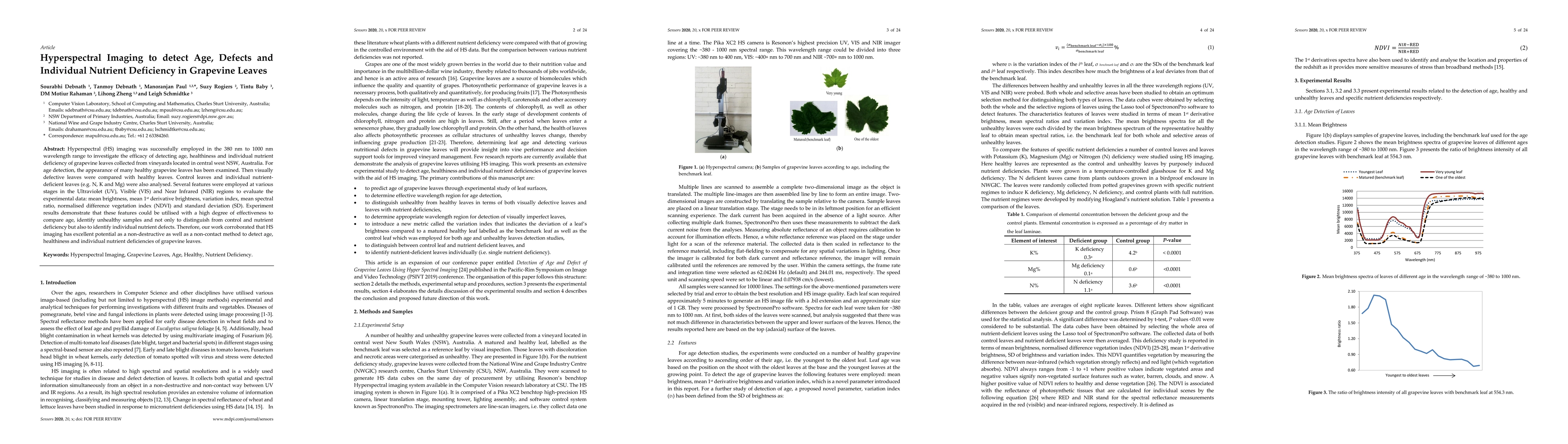 Hyperspectral (HS) imaging was successfully employed in the 380 nm to 1000 nm wavelength range to investigate the efficacy of detecting age, healthiness and individual nutrient deficiency of grapevine leaves collected from vineyards located in central west NSW, Australia. For age detection, the appearance of many healthy grapevine leaves has been examined. Then visually defective leaves were compared with healthy leaves. Control leaves and individual nutrient-deficient leaves (e.g. N, K and Mg) were also analysed. Several features were employed at various stages in the Ultraviolet (UV), Visible (VIS) and Near Infrared (NIR) regions to evaluate the experimental data: mean brightness, mean 1st derivative brightness, variation index, mean spectral ratio, normalised difference vegetation index (NDVI) and standard deviation (SD). Experiment results demonstrate that these features could be utilised with a high degree of effectiveness to compare age, identify unhealthy samples and not only to distinguish from control and nutrient deficiency but also to identify individual nutrient defects. Therefore, our work corroborated that HS imaging has excellent potential as a non-destructive as well as a non-contact method to detect age, healthiness and individual nutrient deficiencies of grapevine leaves