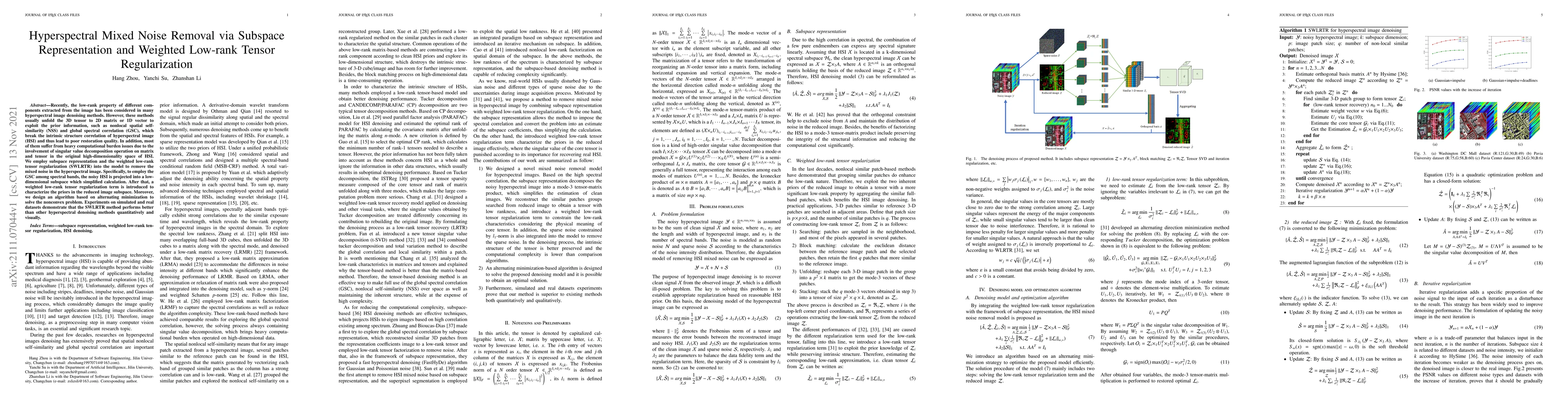 This paper proposes a subspace representation and weighted low-rank tensor regularization (SWLRTR) method for hyperspectral image denoising, addressing mixed noise removal while preserving intrinsic structure correlations. The method projects HSI into a low-dimensional subspace and utilizes a weighted low-rank tensor regularization term, followed by an alternating minimization algorithm, achieving superior performance compared to other methods.