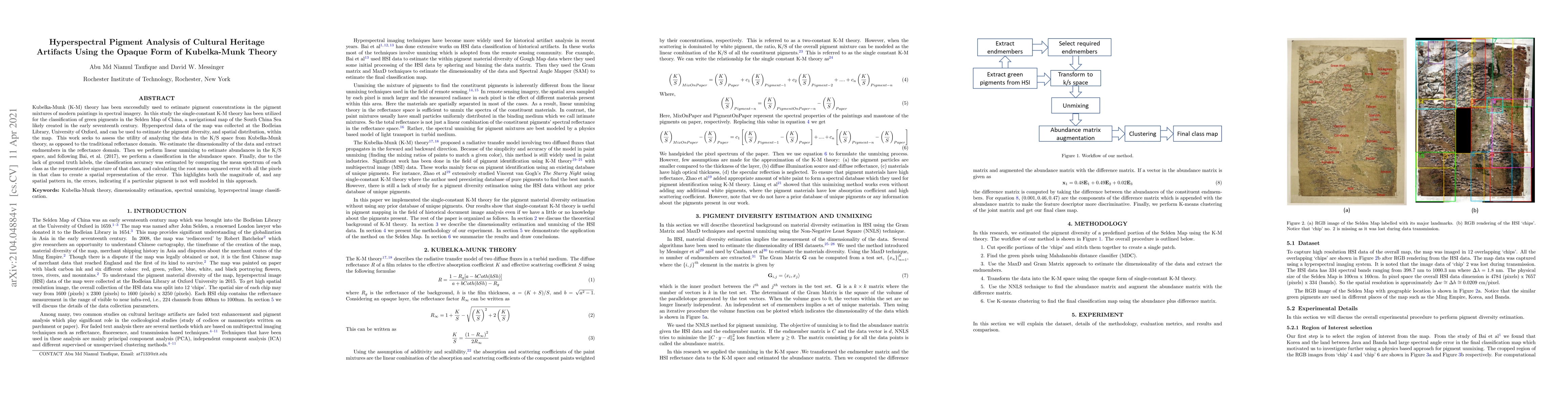 This study applies the Opaque Form of Kubelka-Munk theory to classify green pigments in the Selden Map of China using hyperspectral imaging. The analysis estimates pigment diversity and spatial distribution, demonstrating the utility of K/S space over traditional reflectance domain methods.