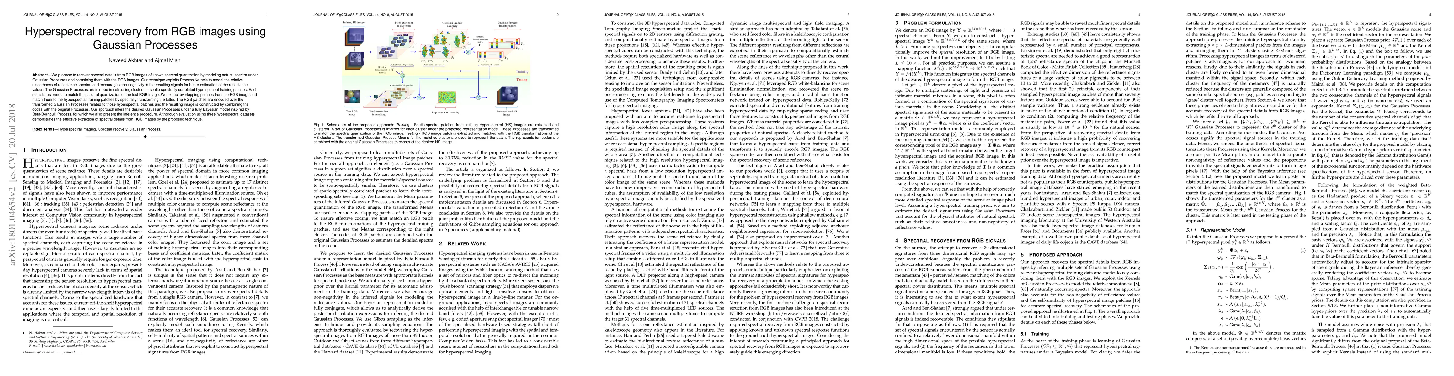 This paper proposes a method for recovering spectral details from RGB images using Gaussian Processes, leveraging Process Kernels to model reflectance spectra and employing a Bayesian inference procedure. The technique effectively extracts spectral information by transforming hyperspectral training patches and combining them with RGB image patches.