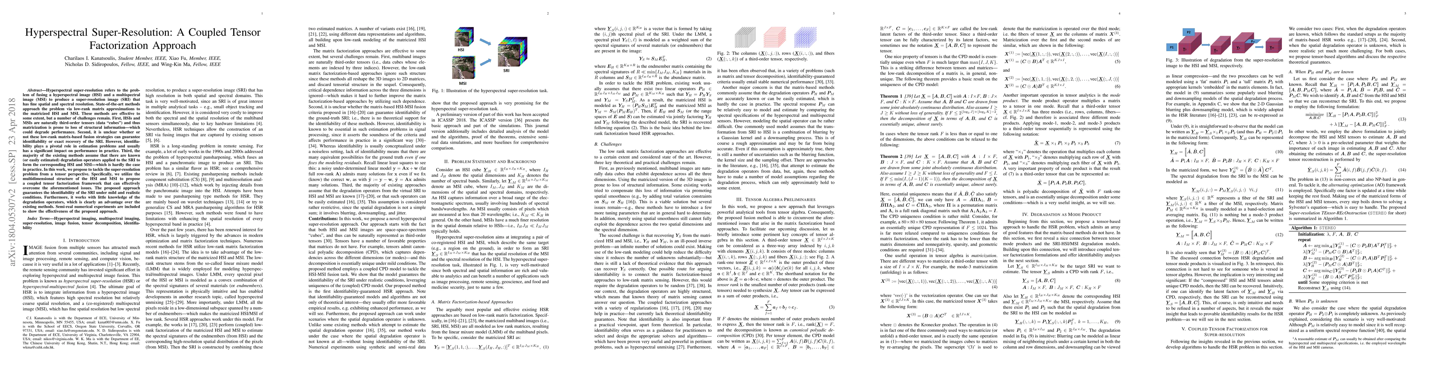 This paper proposes a coupled tensor factorization approach for hyperspectral super-resolution, addressing the challenges of structural information loss, identifiability, and unknown degradation operators. The method leverages the multidimensional structure of hyperspectral and multispectral images to guarantee identifiability and perform well with minimal degradation knowledge.