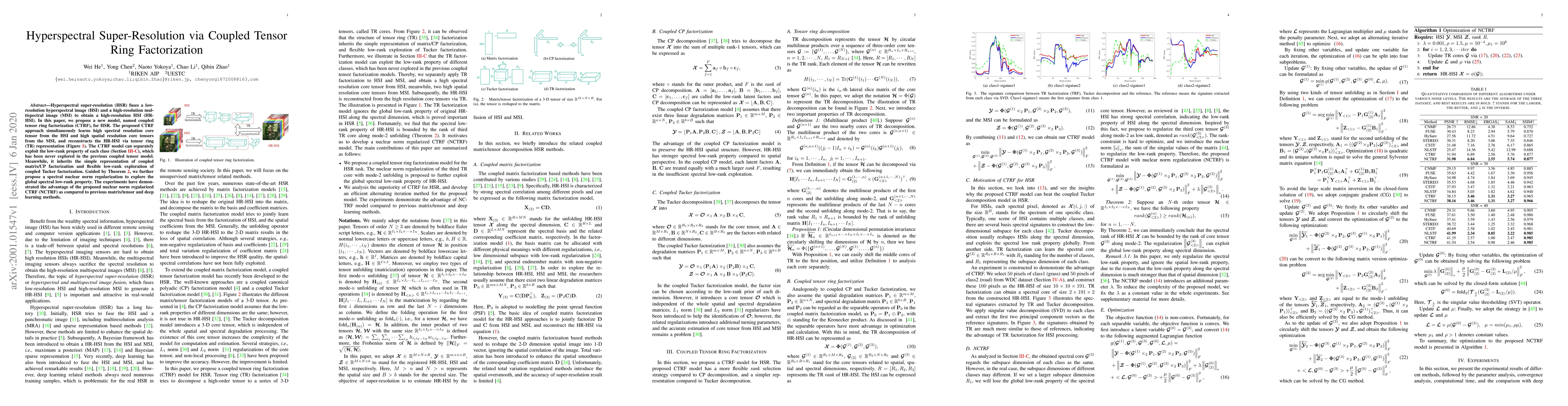 This paper proposes a coupled tensor ring factorization (CTRF) model for hyperspectral super-resolution, which integrates low-resolution hyperspectral and high-resolution multispectral images to generate high-resolution hyperspectral images. The CTRF approach leverages tensor ring representation to separately exploit the low-rank properties of different data classes, demonstrating superior performance over previous methods through spectral nuclear norm regularization.