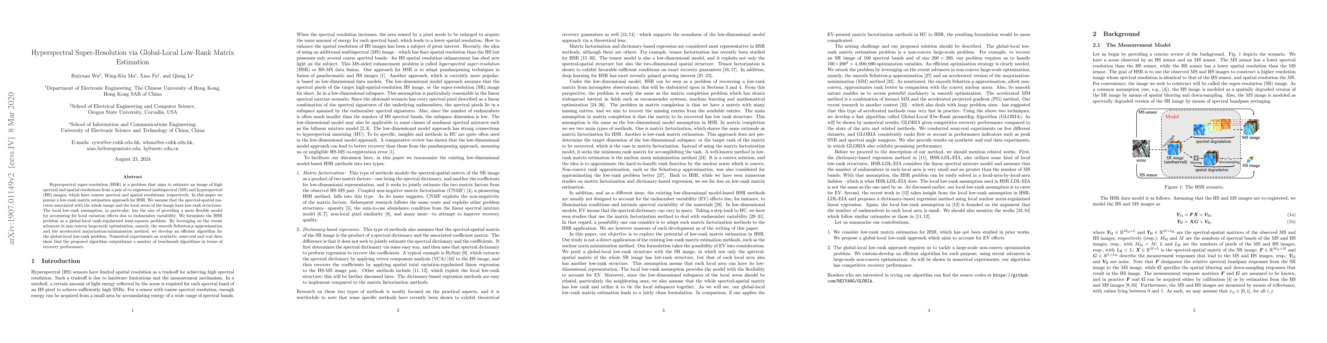 This paper proposes a low-rank matrix estimation method for hyperspectral super-resolution, combining global and local low-rank assumptions to account for both global and local image variations. The developed algorithm leverages advanced optimization techniques and outperforms existing methods in recovery performance.