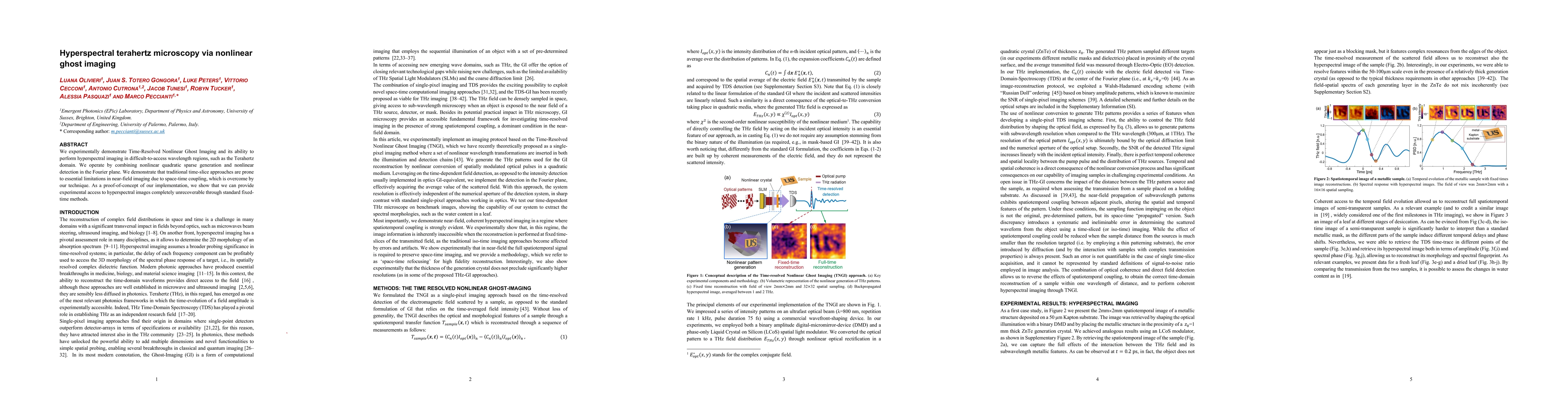 The paper introduces a technique for hyperspectral terahertz microscopy using nonlinear ghost imaging, which overcomes space-time coupling issues in near-field imaging and enables coherent hyperspectral imaging through inverse-propagation reconstruction.