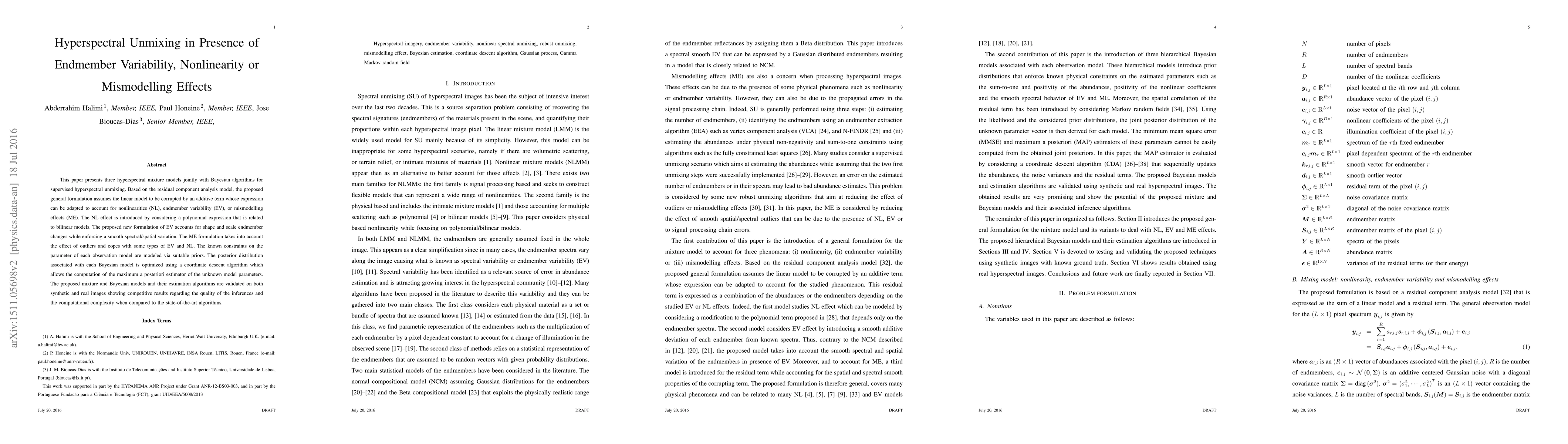 This paper presents three hyperspectral mixture models jointly with Bayesian algorithms for supervised hyperspectral unmixing. Based on the residual component analysis model, the proposed general formulation assumes the linear model to be corrupted by an additive term whose expression can be adapted to account for nonlinearities (NL), endmember variability (EV), or mismodelling effects (ME). The NL effect is introduced by considering a polynomial expression that is related to bilinear models. The proposed new formulation of EV accounts for shape and scale endmember changes while enforcing a smooth spectral/spatial variation. The ME formulation takes into account the effect of outliers and copes with some types of EV and NL. The known constraints on the parameter of each observation model are modeled via suitable priors. The posterior distribution associated with each Bayesian model is optimized using a coordinate descent algorithm which allows the computation of the maximum a posteriori estimator of the unknown model parameters. The proposed mixture and Bayesian models and their estimation algorithms are validated on both synthetic and real images showing competitive results regarding the quality of the inferences and the computational complexity when compared to the state-of-the-art algorithms.