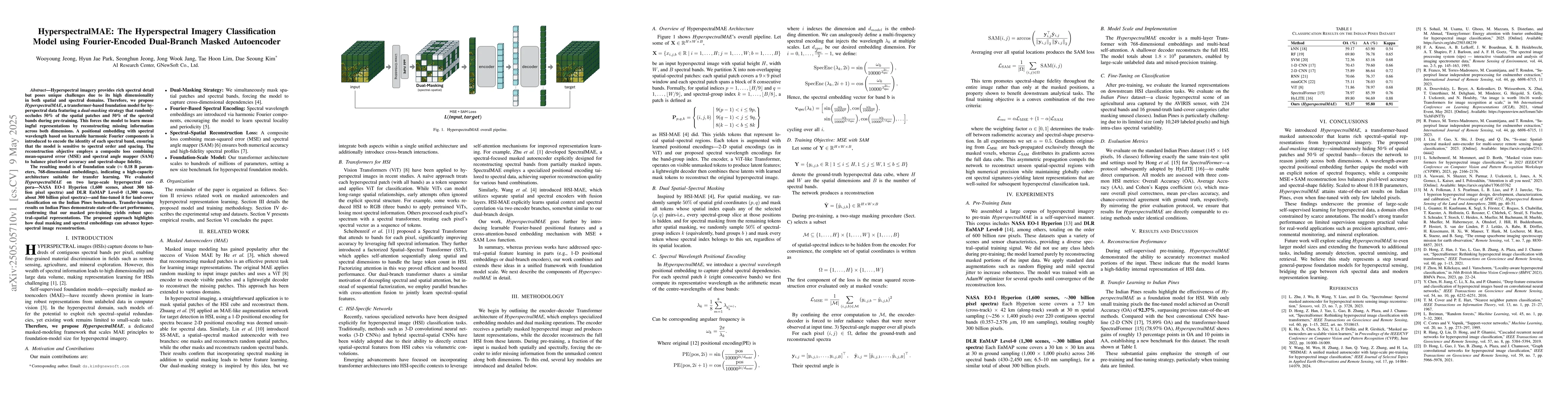 This research is significant as it advances hyperspectral image reconstruction and downstream analysis, providing a powerful foundation model for hyperspectral data that can be fine-tuned for various applications like land-cover classification.