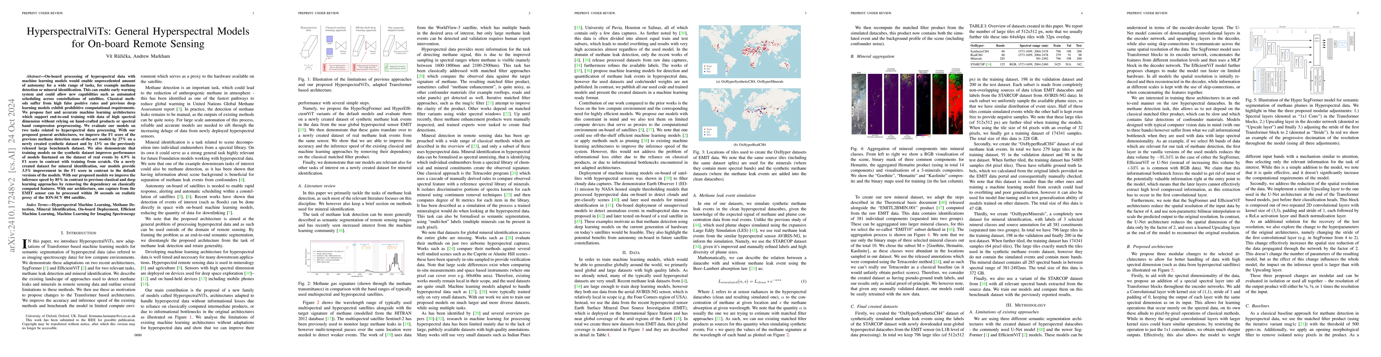 On-board processing of hyperspectral data with machine learning models would enable unprecedented amount of autonomy for a wide range of tasks, for example methane detection or mineral identification. Methane is the second most important greenhouse gas contributor to climate change, and it's automated detection on-board of satellites using machine learning models would allow for early warning system and could enable new capabilities such as automated scheduling inside constellations of satellites. Classical methods for methane detection suffer from high false positive rates and previous deep learning models exhibit prohibitive computational requirements. We propose fast and accurate machine learning architectures which support end-to-end training with data of high spectral dimension. We evaluate our models on two tasks related to hyperspectral data processing - methane leak detection and mineral identification. With our proposed general architectures, we improve the F1 score of the previous methane detection state-of-the-art models by more than 27% on a newly created synthetic dataset and by almost 13% on the previously released large benchmark dataset. We also demonstrate that training models on the synthetic dataset improves performance of models finetuned on the dataset of real events by 6.9% in F1 score in contrast with training from scratch. On a newly created dataset for mineral identification, our models provide 3.5% improvement in the F1 score in contrast to the default versions of the models. With our proposed models we improve the inference speed by 85.19% in contrast to previous classical and deep learning approaches by removing the dependency on classically computed features. Namely, one capture from the EMIT sensor can be processed in only 30 seconds on a realistic proxy hardware used on the ION-SCV 004 satellite.