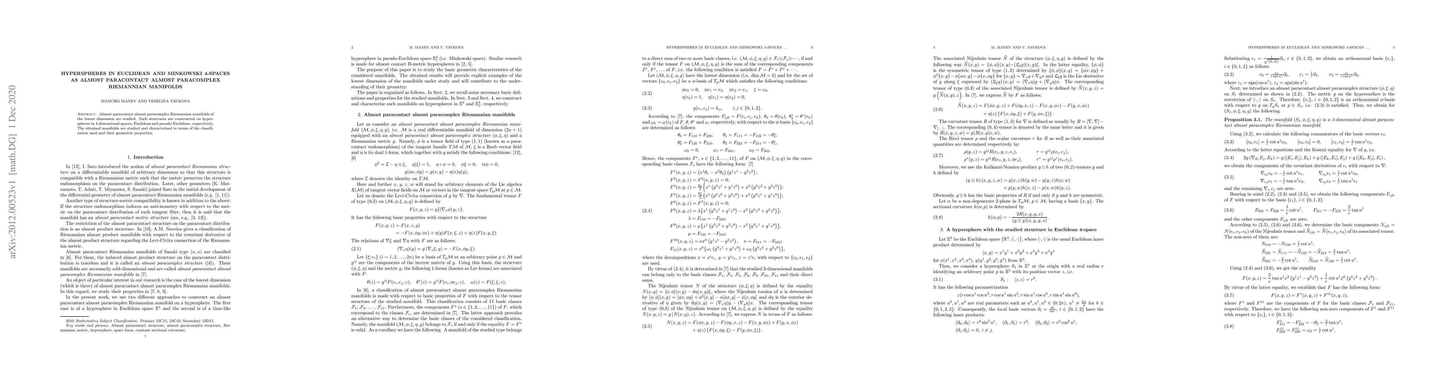 This paper investigates almost paracontact almost paracomplex Riemannian manifolds on hyperspheres in 4-dimensional Euclidean and Minkowski spaces, classifying and characterizing their geometric properties. The study focuses on the lowest-dimensional structures of these manifolds.