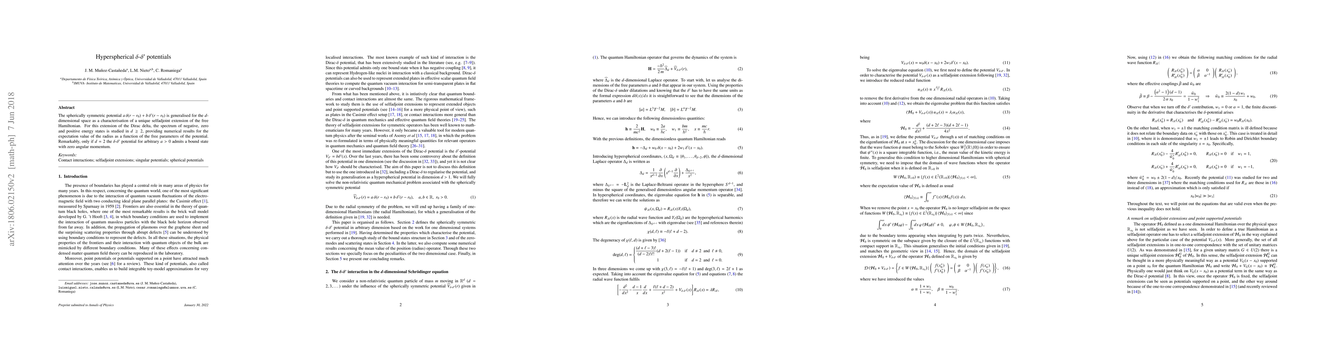 The spherically symmetric potential $a \,\delta (r-r_0)+b\,\delta ' (r-r_0)$ is generalised for the $d$-dimensional space as a characterisation of a unique selfadjoint extension of the free Hamiltonian. For this extension of the Dirac delta, the spectrum of negative, zero and positive energy states is studied in $d\geq 2$, providing numerical results for the expectation value of the radius as a function of the free parameters of the potential. Remarkably, only if $d=2$ the $\delta$-$\delta'$ potential for arbitrary $a>0$ admits a bound state with zero angular momentum.
