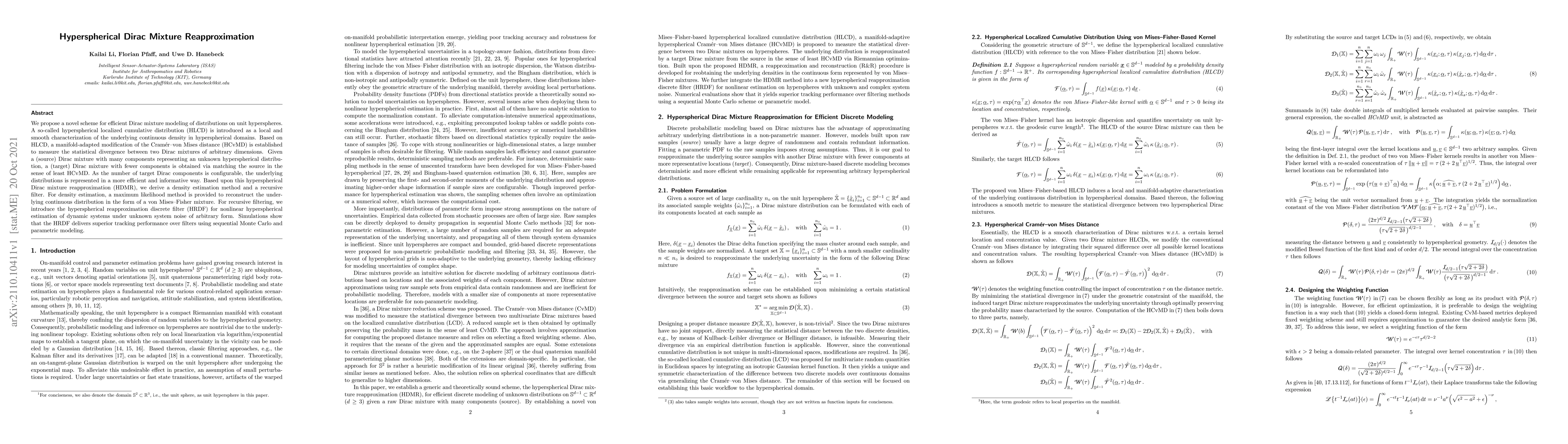We propose a novel scheme for efficient Dirac mixture modeling of distributions on unit hyperspheres. A so-called hyperspherical localized cumulative distribution (HLCD) is introduced as a local and smooth characterization of the underlying continuous density in hyperspherical domains. Based on HLCD, a manifold-adapted modification of the Cram\'er-von Mises distance (HCvMD) is established to measure the statistical divergence between two Dirac mixtures of arbitrary dimensions. Given a (source) Dirac mixture with many components representing an unknown hyperspherical distribution, a (target) Dirac mixture with fewer components is obtained via matching the source in the sense of least HCvMD. As the number of target Dirac components is configurable, the underlying distributions is represented in a more efficient and informative way. Based upon this hyperspherical Dirac mixture reapproximation (HDMR), we derive a density estimation method and a recursive filter. For density estimation, a maximum likelihood method is provided to reconstruct the underlying continuous distribution in the form of a von Mises-Fisher mixture. For recursive filtering, we introduce the hyperspherical reapproximation discrete filter (HRDF) for nonlinear hyperspherical estimation of dynamic systems under unknown system noise of arbitrary form. Simulations show that the HRDF delivers superior tracking performance over filters using sequential Monte Carlo and parametric modeling.