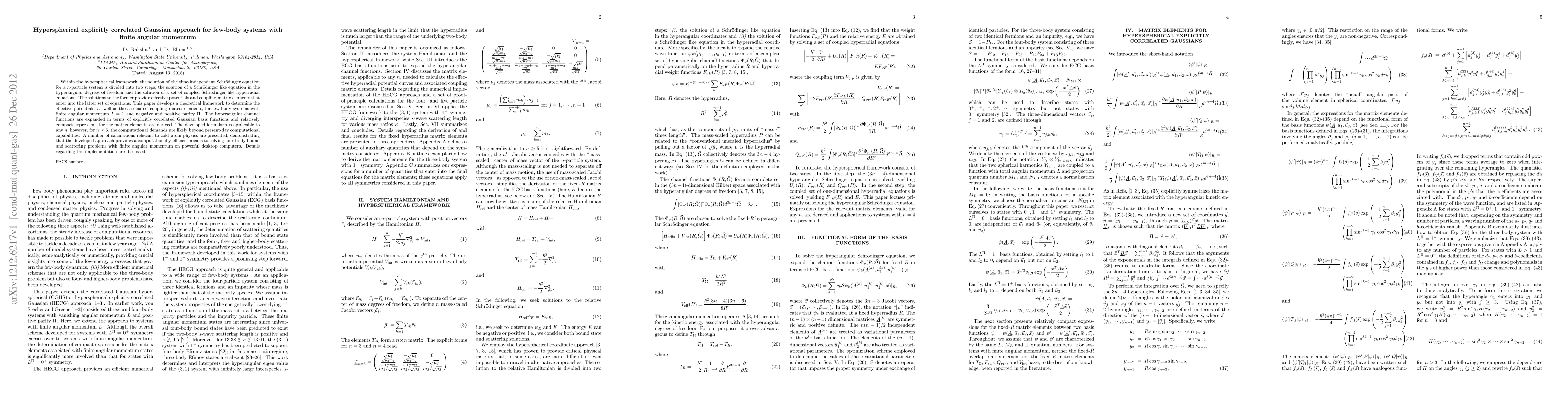This paper introduces a hyperspherical explicitly correlated Gaussian approach to solve the time-independent Schrödinger equation for few-body systems with finite angular momentum. The method efficiently computes effective potentials and coupling matrix elements for systems with L=1, demonstrating its applicability to cold atom physics problems.