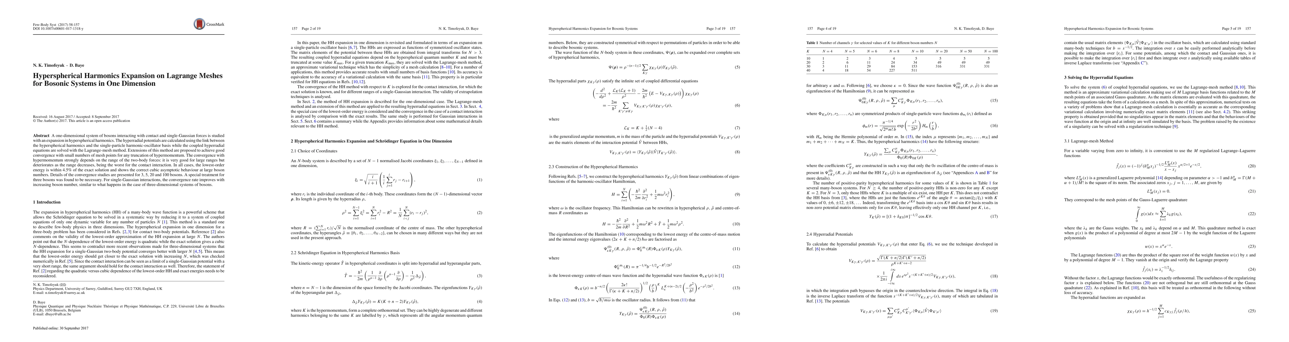 A one-dimensional system of bosons interacting with contact and single-Gaussian forces is studied with an expansion in hyperspherical harmonics. The hyperradial potentials are calculated using the link between the hyperspherical harmonics and the single-particle harmonic-oscillator basis while the coupled hyperradial equations are solved with the Lagrange-mesh method. Extensions of this method are proposed to achieve good convergence with small numbers of mesh points for any truncation of hypermomentum. The convergence with hypermomentum strongly depends on the range of the two-body forces: it is very good for large ranges but deteriorates as the range decreases, being the worst for the contact interaction. In all cases, the lowest-order energy is within 4.5$\%$ of the exact solution and shows the correct cubic asymptotic behaviour at large boson numbers. Details of the convergence studies are presented for 3, 5, 20 and 100 bosons. A special treatment for three bosons was found to be necessary. For single-Gaussian interactions, the convergence rate improves with increasing boson number, similar to what happens in the case of three-dimensional systems of bosons.
