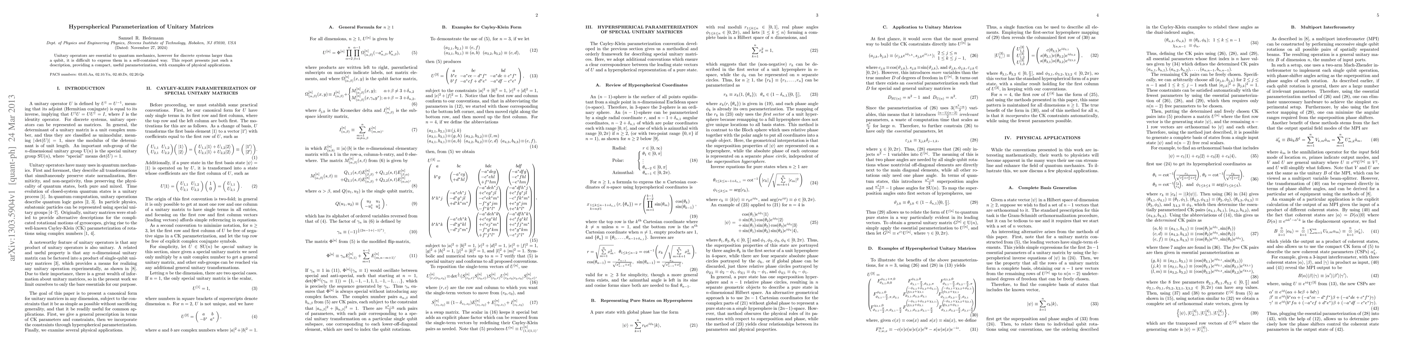 This paper introduces a hyperspherical parameterization for unitary matrices, offering a compact and self-contained representation for discrete quantum systems beyond qubits, with practical applications in quantum mechanics.