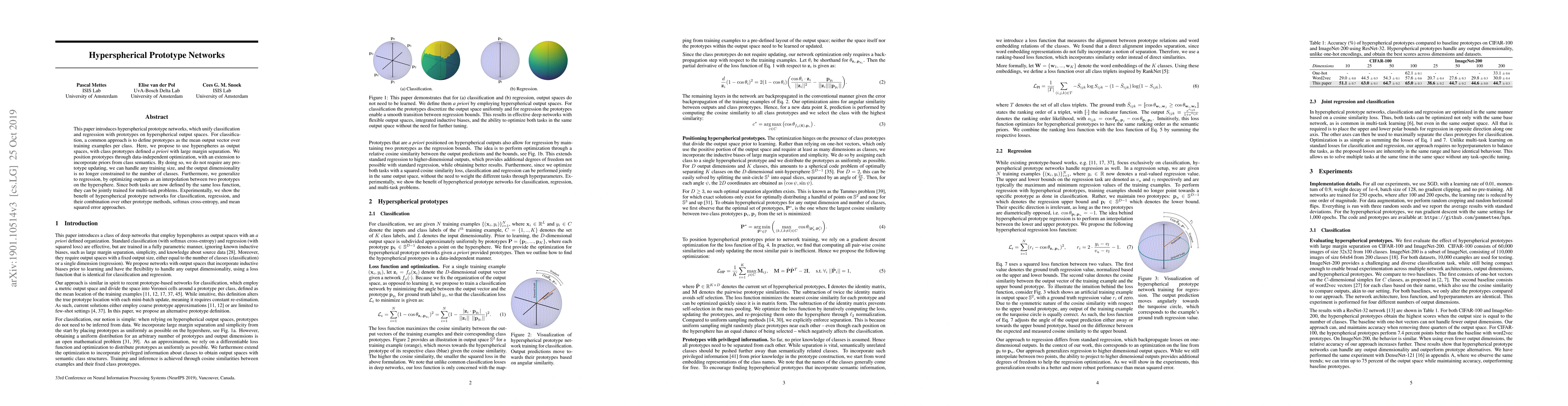 Hyperspherical prototype networks unify classification and regression tasks using hyperspherical output spaces with a priori defined prototypes, offering benefits for multi-task problems and improved performance over existing methods.