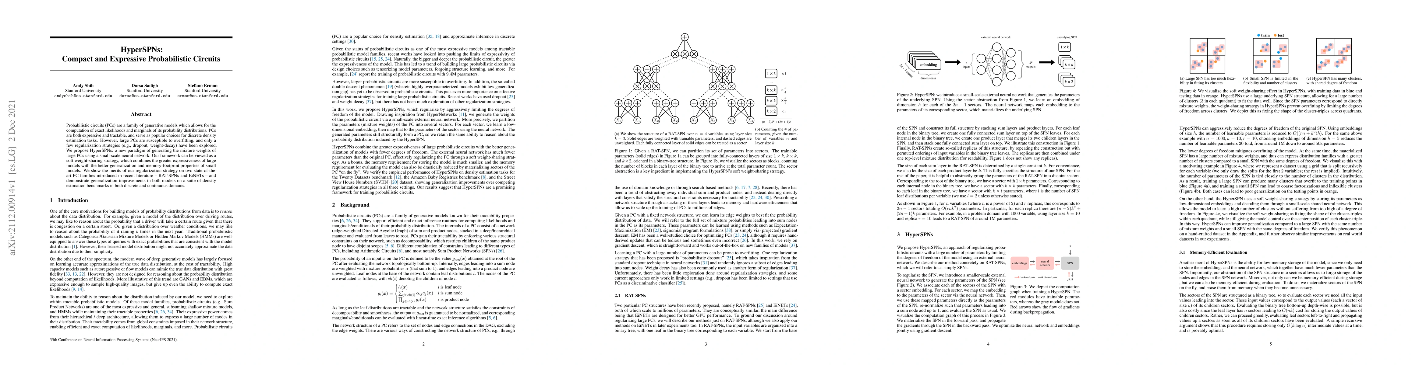 This paper proposes HyperSPNs, a novel regularization method for probabilistic circuits (PCs) that uses a small-scale neural network to generate mixture weights, combining the expressiveness of large PCs with the generalization and memory benefits of small models. The method demonstrates improved performance and generalization in RAT-SPNs and EiNETs across various density estimation tasks.