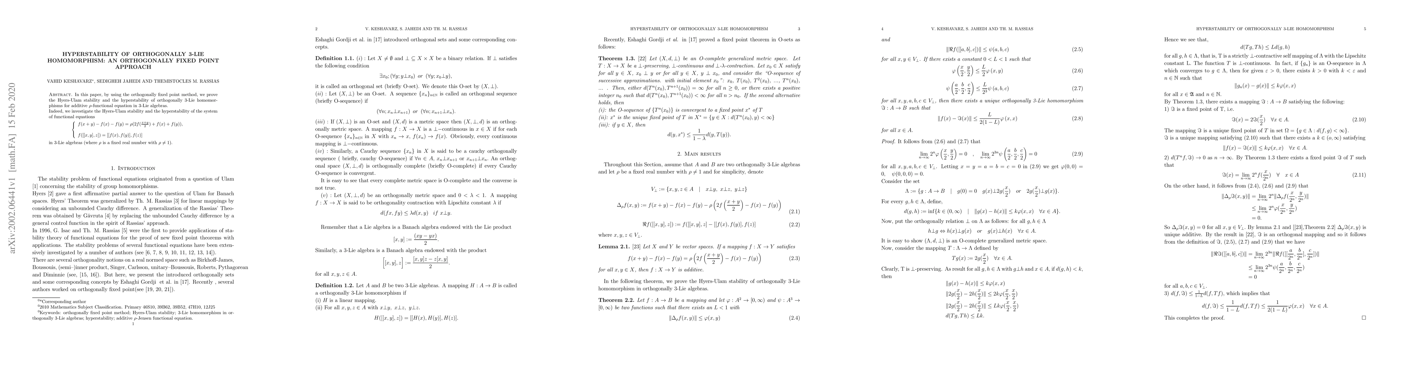 This paper proves the Hyers-Ulam stability and hyperstability of orthogonally 3-Lie homomorphisms using the orthogonally fixed point method for the additive $\rho$-functional equation in 3-Lie algebras. It investigates the stability of the system of functional equations involving both additive and Lie bracket forms.
