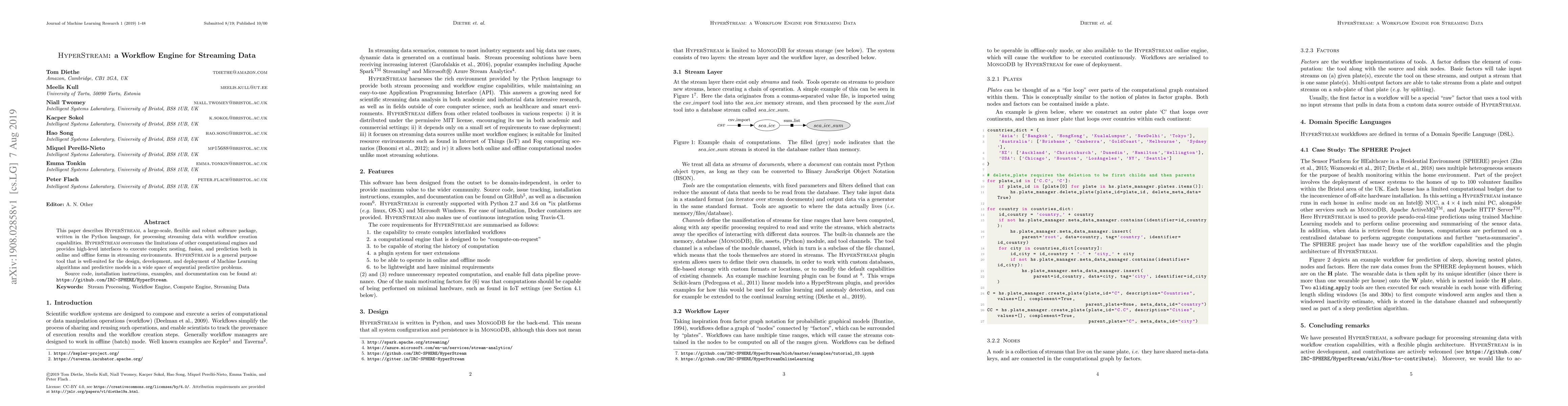 This paper describes HyperStream, a large-scale, flexible and robust software package, written in the Python language, for processing streaming data with workflow creation capabilities. HyperStream overcomes the limitations of other computational engines and provides high-level interfaces to execute complex nesting, fusion, and prediction both in online and offline forms in streaming environments. HyperStream is a general purpose tool that is well-suited for the design, development, and deployment of Machine Learning algorithms and predictive models in a wide space of sequential predictive problems. Source code, installation instructions, examples, and documentation can be found at: https://github.com/IRC-SPHERE/HyperStream.