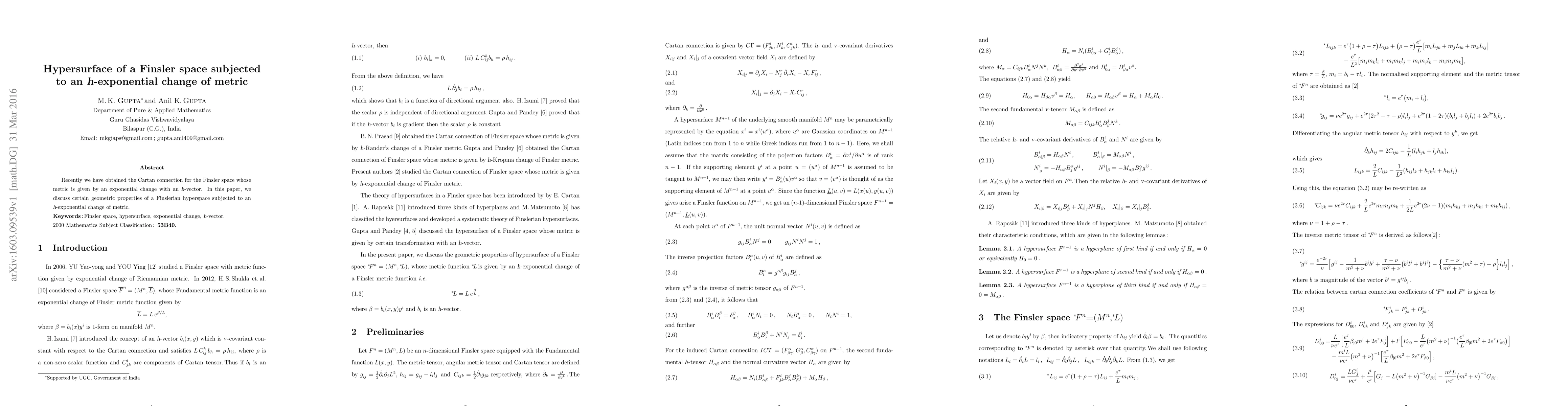 Summary: This paper explores the Cartan connection and geometric properties of a Finsler space under an h-exponential metric change, focusing on the implications for the hypersurface within the Finslerian framework.