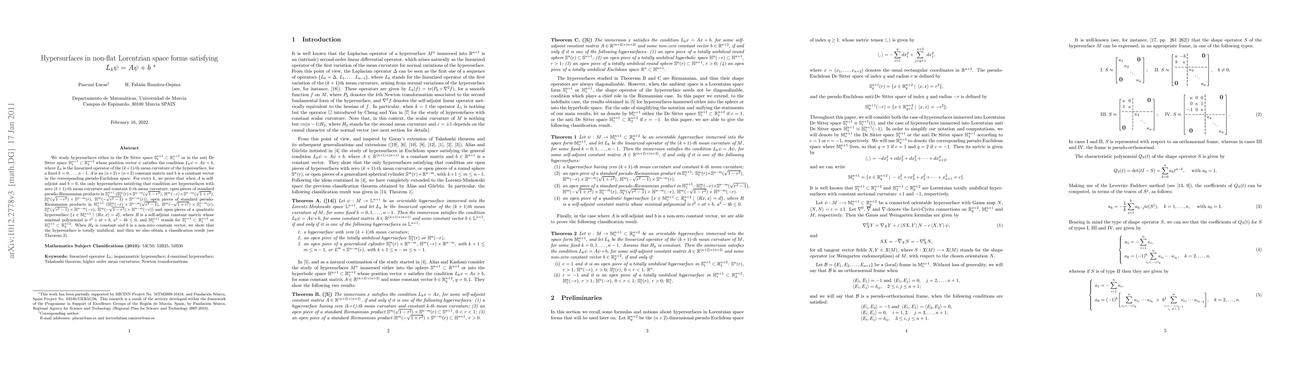 We study hypersurfaces either in the De Sitter space $\S_1^{n+1}\subset\R_1^{n+2}$ or in the anti De Sitter space $\H_1^{n+1}\subset\R_2^{n+2}$ whose position vector $\psi$ satisfies the condition $L_k\psi=A\psi+b$, where $L_k$ is the linearized operator of the $(k+1)$-th mean curvature of the hypersurface, for a fixed $k=0,...,n-1$, $A$ is an $(n+2)\times(n+2)$ constant matrix and $b$ is a constant vector in the corresponding pseudo-Euclidean space. For every $k$, we prove that when $A$ is self-adjoint and $b=0$, the only hypersurfaces satisfying that condition are hypersurfaces with zero $(k+1)$-th mean curvature and constant $k$-th mean curvature, open pieces of standard pseudo-Riemannian products in $\S_1^{n+1}$ ($\S_1^m(r)\times\S^{n-m}(\sqrt{1-r^2})$, $\H^m(-r)\times\S^{n-m}(\sqrt{1+r^2})$, $\S_1^m(\sqrt{1-r^2})\times\S^{n-m}(r)$, $\H^m(-\sqrt{r^2-1})\times\S^{n-m}(r)$), open pieces of standard pseudo-Riemannian products in $\H_1^{n+1}$ ($\H_1^m(-r)\times\S^{n-m}(\sqrt{r^2-1})$, $\H^m(-\sqrt{1+r^2})\times\S_1^{n-m}(r)$, $\S_1^m(\sqrt{r^2-1})\times\H^{n-m}(-r)$, $\H^m(-\sqrt{1-r^2})\times\H^{n-m}(-r)$) and open pieces of a quadratic hypersurface $\{x\in\mathbb{M}_{c}^{n+1}\;|\;Rx,x=d\}$, where $R$ is a self-adjoint constant matrix whose minimal polynomial is $t^2+at+b$, $a^2-4b\leq 0$, and $\mathbb{M}_{c}^{n+1}$ stands for $\S_1^{n+1}\subset\R_1^{n+2}$ or $\H_1^{n+1}\subset\R_2^{n+2}$. When $H_k$ is constant and $b$ is a non-zero constant vector, we show that the hypersurface is totally umbilical, and then we also obtain a classification result (see Theorem 2).
