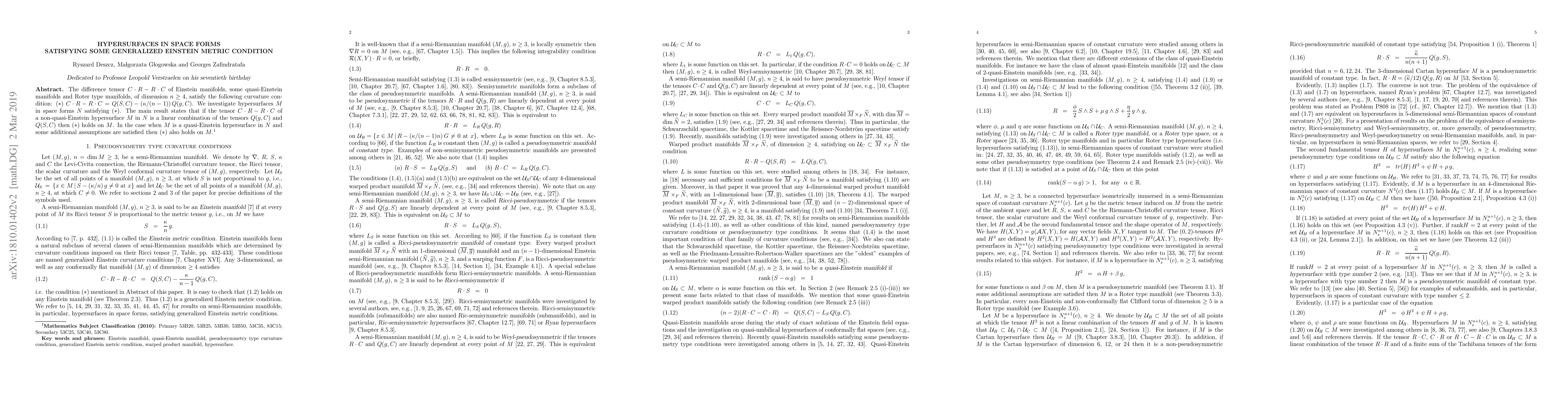 This paper investigates hypersurfaces in space forms that satisfy the generalized Einstein metric condition (A): (C.R - R.C = Q(S,C) - (k/(n-1)) Q(g,C)). The main result shows that if the tensor C.R - R.C of a non-quasi-Einstein hypersurface is a linear combination of Q(g,C) and Q(S,C), then condition (A) holds. Additional conditions allow (A) to hold for quasi-Einstein hypersurfaces.