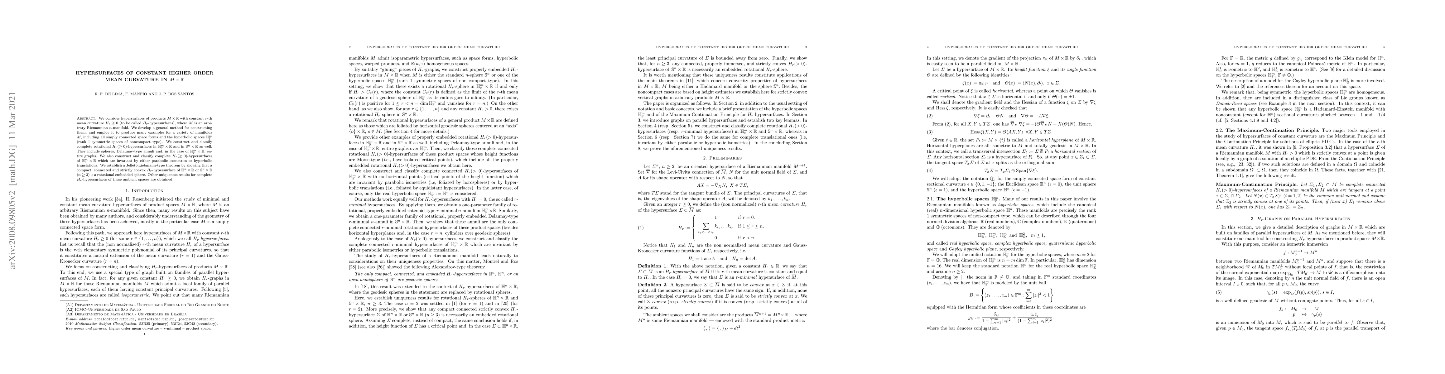 This paper develops a method for constructing hypersurfaces in $M\times\mathbb{R}$ with constant $r$-th mean curvature, producing examples across various manifolds including space forms and hyperbolic spaces. It classifies complete rotational hypersurfaces and establishes uniqueness results, proving that strictly convex compact $H_r$-hypersurfaces in $\mathbb{H}_{\mathbb F}^m\times\mathbb R$ or $\mathbb S^n\times\mathbb R$ are embedded spheres.