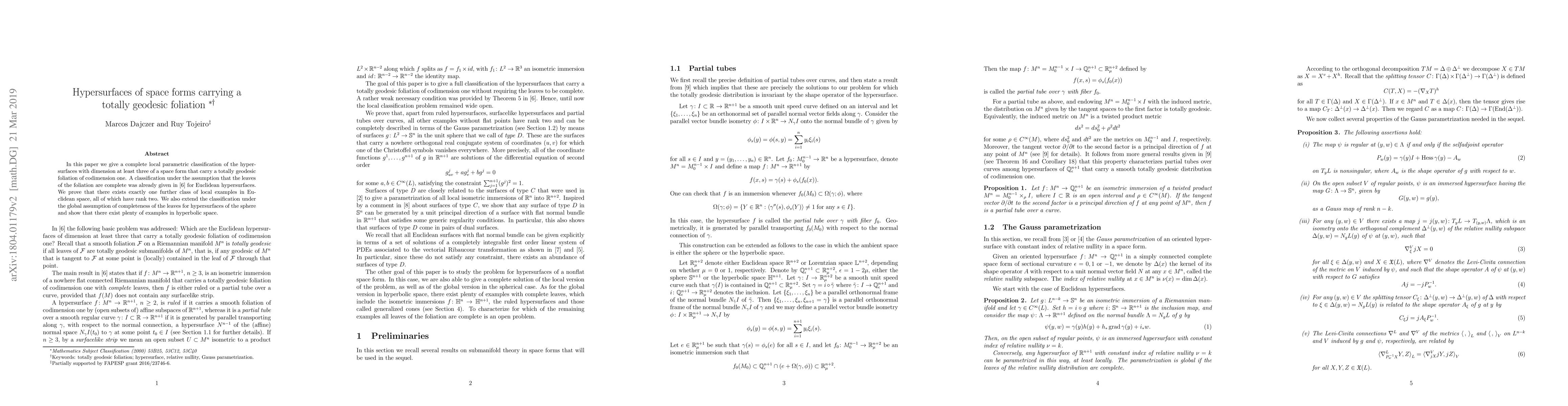 In this paper we give a complete local parametric classification of the hypersurfaces with dimension at least three of a space form that carry a totally geodesic foliation of codimension one. A classification under the assumption that the leaves of the foliation are complete was given in \cite{drt} for Euclidean hypersurfaces. We prove that there exists exactly one further class of local examples in Euclidean space, all of which have rank two. We also extend the classification under the global assumption of completeness of the leaves for hypersurfaces of the sphere and show that there exist plenty of examples in hyperbolic space.