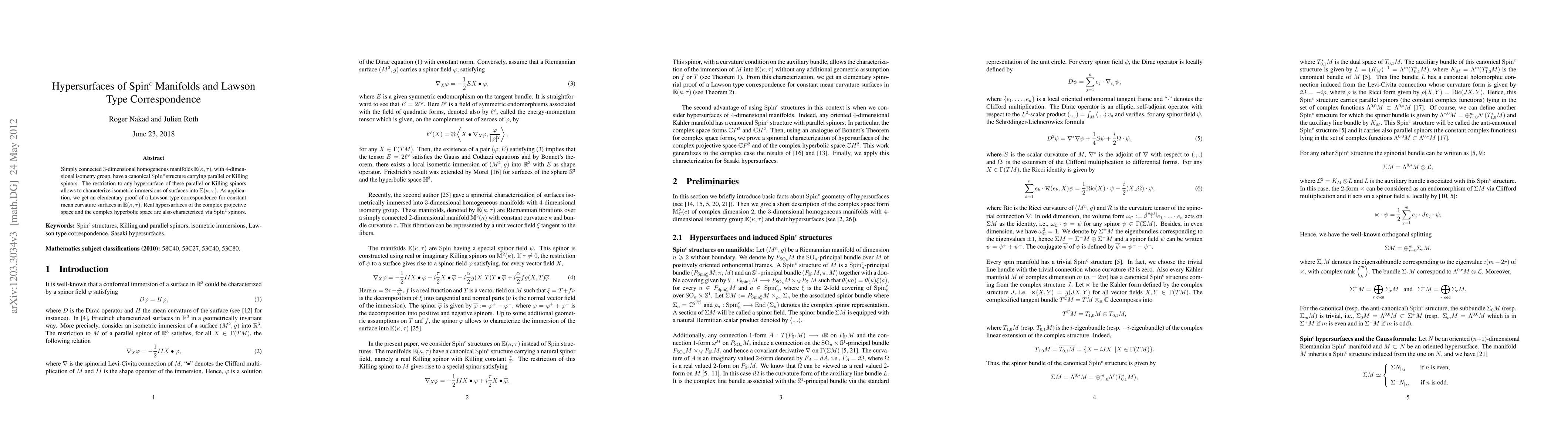 Simply connected 3-dimensional homogeneous manifolds $E(\kappa, \tau)$, with 4-dimensional isometry group, have a canonical Spin$^c$ structure carrying parallel or Killing spinors. The restriction to any hypersurface of these parallel or Killing spinors allows to characterize isometric immersions of surfaces into $E(\kappa, \tau)$. As application, we get an elementary proof of a Lawson type correspondence for constant mean curvature surfaces in $E(\kappa, \tau)$. Real hypersurfaces of the complex projective space and the complex hyperbolic space are also characterized via Spin$^c$ spinors.