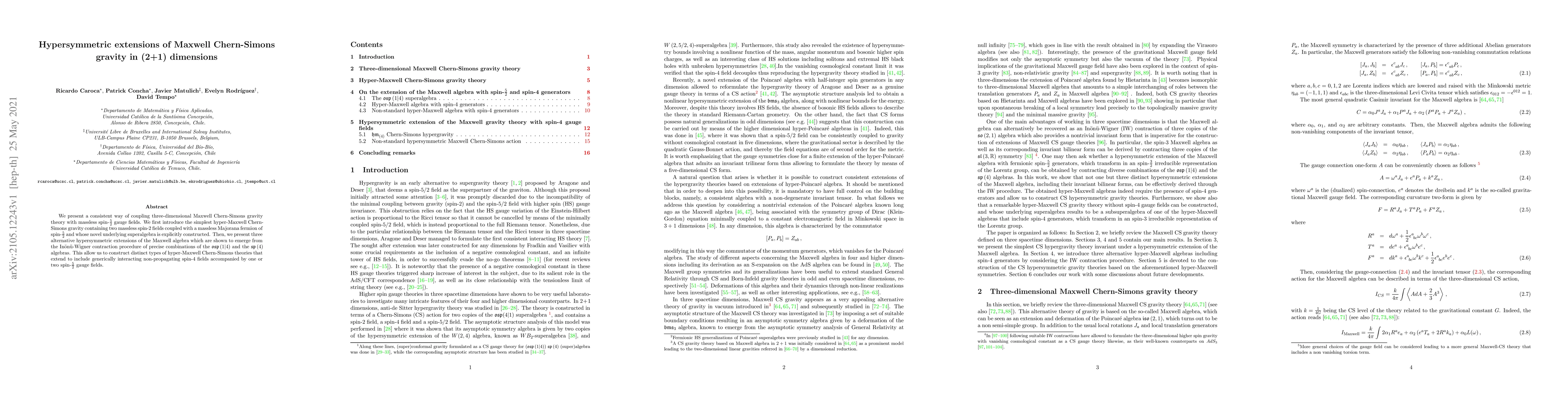 We present a consistent way of coupling three-dimensional Maxwell Chern-Simons gravity theory with massless spin-$\frac{5}{2}$ gauge fields. We first introduce the simplest hyper-Maxwell Chern-Simons gravity containing two massless spin-2 fields coupled with a massless Majorana fermion of spin-$\frac{5}{2}$ and whose novel underlying superalgebra is explicitly constructed. Then, we present three alternative hypersymmetric extensions of the Maxwell algebra which are shown to emerge from the In\"on\"u-Wigner contraction procedure of precise combinations of the $\mathfrak{osp}\left(1|4\right)$ and the $\mathfrak{sp}\left(4\right)$ algebras. This allow us to construct distinct types of hyper-Maxwell Chern-Simons theories that extend to include generically interacting non-propagating spin-$4$ fields accompanied by one or two spin-$\frac{5}{2}$ gauge fields.