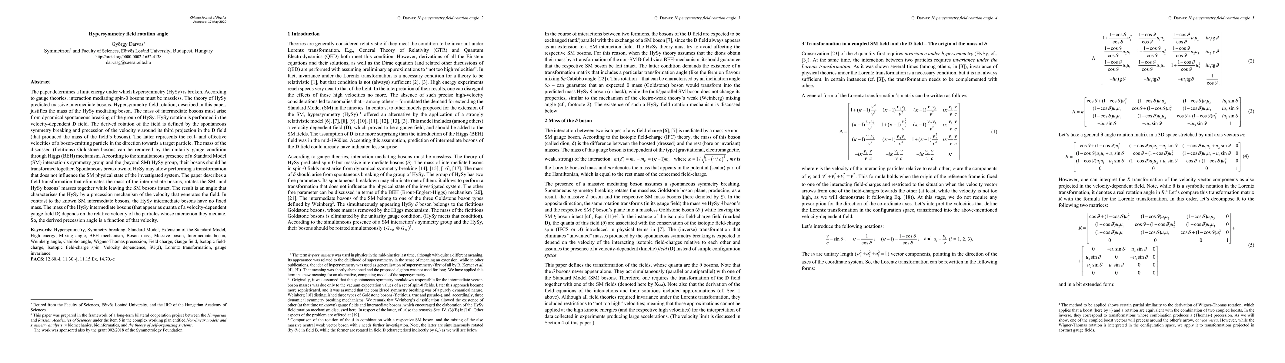 The paper determines the limit energy under which hypersymmetry (HySy) is broken. According to gauge theories, interaction mediating spin-0 bosons must be massless. The theory of HySy predicted massive intermediate bosons. Hypersymmetry field rotation, described in this paper, justifies the mass of the HySy mediating boson. The mass of intermediate bosons must arise from dynamical spontaneous breaking of the group of HySy. HySy rotation is performed in the velocity-dependent D field. The derived rotation of the field is defined by the spontaneous symmetry breaking and precession of the velocity v around its third projection in the D field (that produced the mass of the field s bosons). The latter represents the real and effective velocities of a boson-emitting particle in the direction towards a target particle. The mass of the discussed (fictitious) Goldstone bosons can be removed by the unitarity gauge condition through Higgs (BEH) mechanism. According to the simultaneous presence of a Standard Model (SM) interaction s symmetry group and the (beyond SM) HySy group, their bosons should be transformed together. Spontaneous breakdown of HySy may allow performing a transformation that does not influence the SM physical state of the investigated system. The paper describes a field transformation that eliminates the mass of the intermediate bosons, rotates the SM- and HySy bosons masses together while leaving the SM bosons intact. The result is an angle that characterises the HySy by a precession mechanism of the velocity that generates the field. In contrast to the known SM intermediate bosons, the HySy intermediate bosons have no fixed mass. The mass of the HySy intermediate bosons (that appear as quanta of a velocity-dependent gauge field D) depends on the relative velocity of the particles whose interaction they mediate. So, the derived precession angle is a function of that velocity.